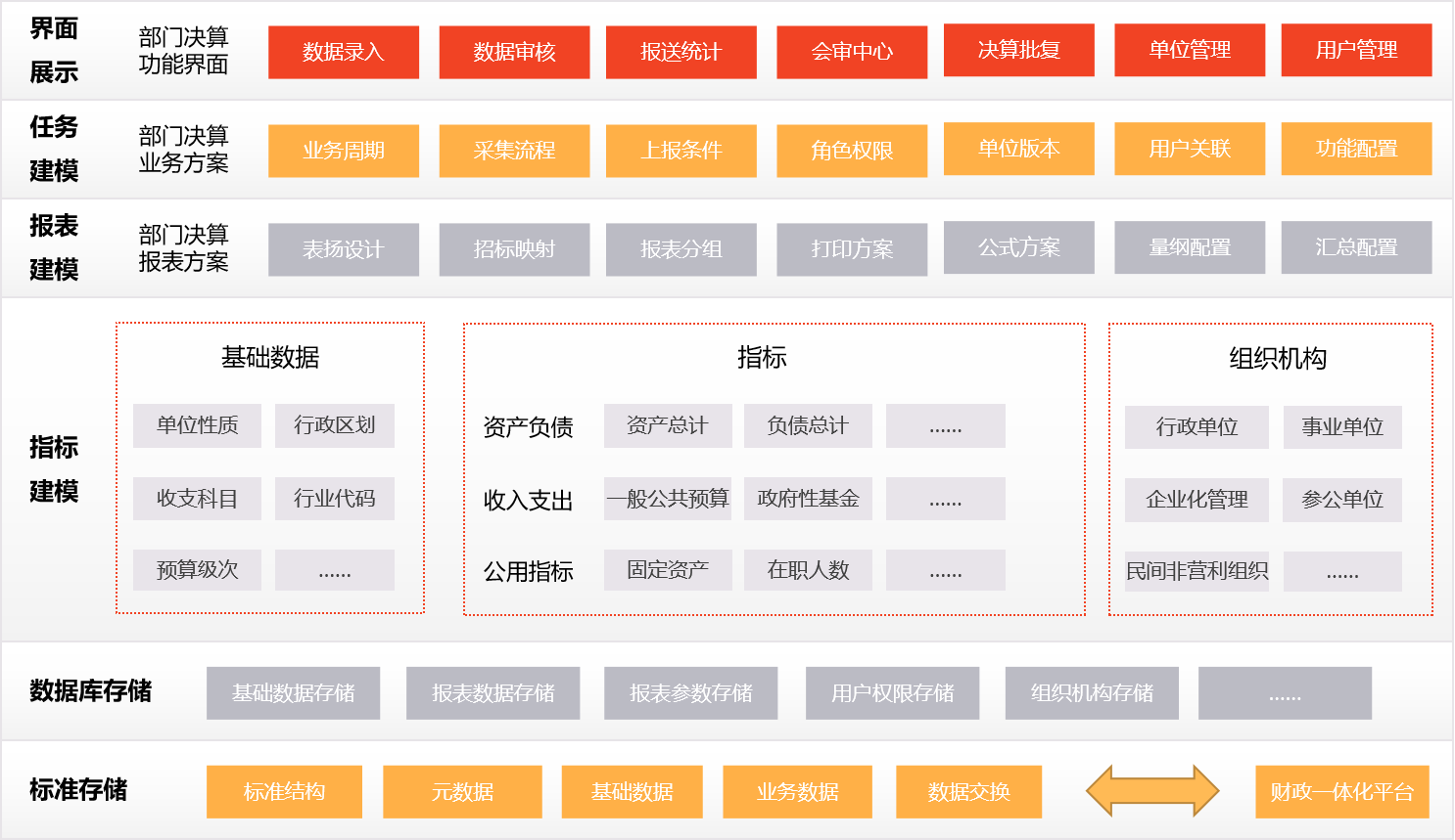 系统功能架构分为6大层次结构,在标准存储以上,为系统各功能架构,可以满足部门决算业务开展的各项需求。标准存储用于将系统产生的各项业务数据按照财政数据标准化体系进行处理,形成符合财政预算管理一体化要求的标准数据,从而实现数据的互通共享。