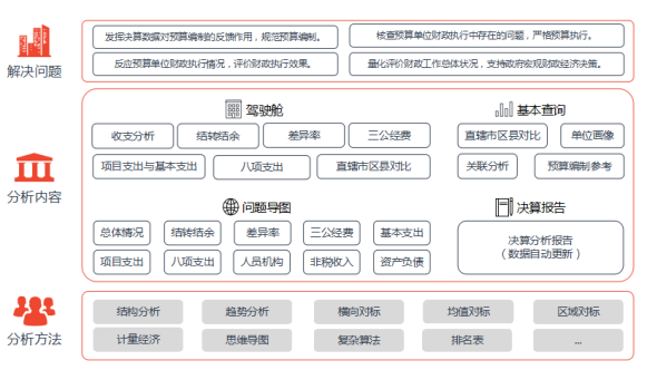 本方案以部门决算报表数据为数据基础,利用对比分析、结构分析、趋势分析等统计学方法和回归分析等计量经济学方法等多种方法相结合,对部门决算数据进行全方位、多角度的分析,并将分析结果以可视化形式展示,形成以、问题导图和分析报告为主要内容的三大数据分析板块。
