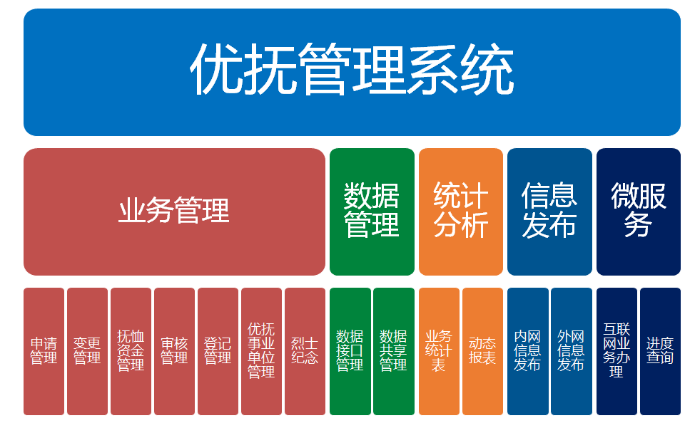 1、提供覆盖全业务、贯通各级管理部门、面向全优抚对象的集中式、一体化经办服务支撑。