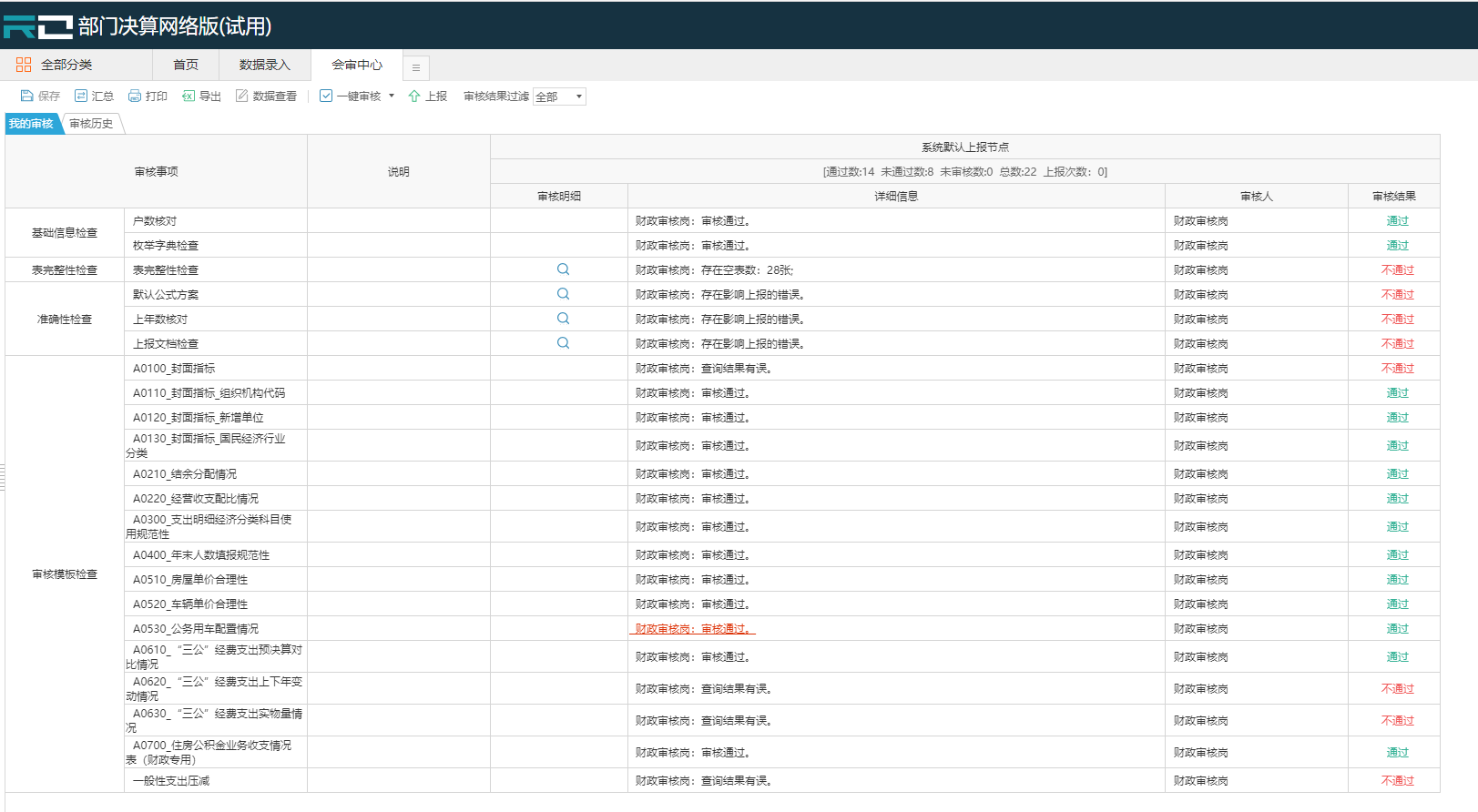 一键审核:部门决算报表审核中有多项数据审核内容,通过建设强大的会审中心,可以一键完成对决算审核中的所有审核事项,提高决算审核效率。