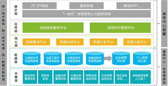 交通运输行业信用信息管理系统以成熟的先进的技术,完善并保持已建设系统的应用体系,集成各种信用体系的基础数据和动态数据,实现统一的信用征集渠道,建设统一的企业与个人信用评价体系,提供统一的信用信息服务。实现“征信-评价-应用-服务”的交通建设与运输市场信用信息体系架构。