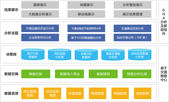 交通决策支持解决方案面向交通运输管理部门,实现各类统计信息、动态监测数据、年鉴数据、普查及调查等数据的采集、关联和挖掘分析及结果多种形式展示。