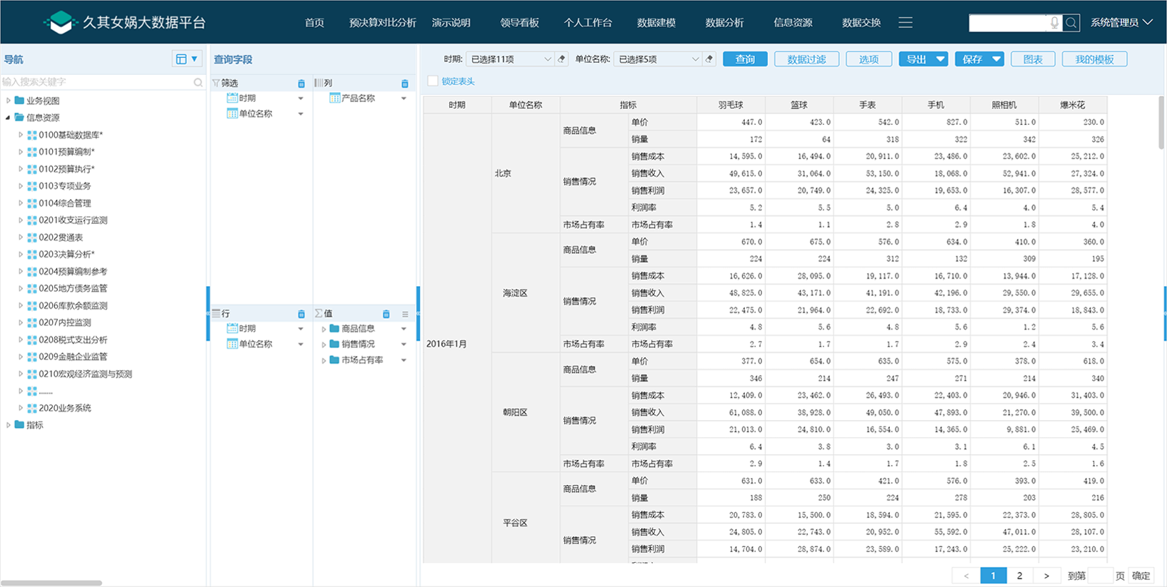 女娲大数据平台提供了丰富多样的数据可视化工具,包括即席查询、快速分析表(非结构化报表)、统计图表、仪表盘、智能分析报告、GIS数据地图等,用户可以利用这些可视化工具构建满足自己需要的任意复杂的可视化分析页面,并通过PC、智能移动终端、动态监控大屏、微信等平台发布分析结果。