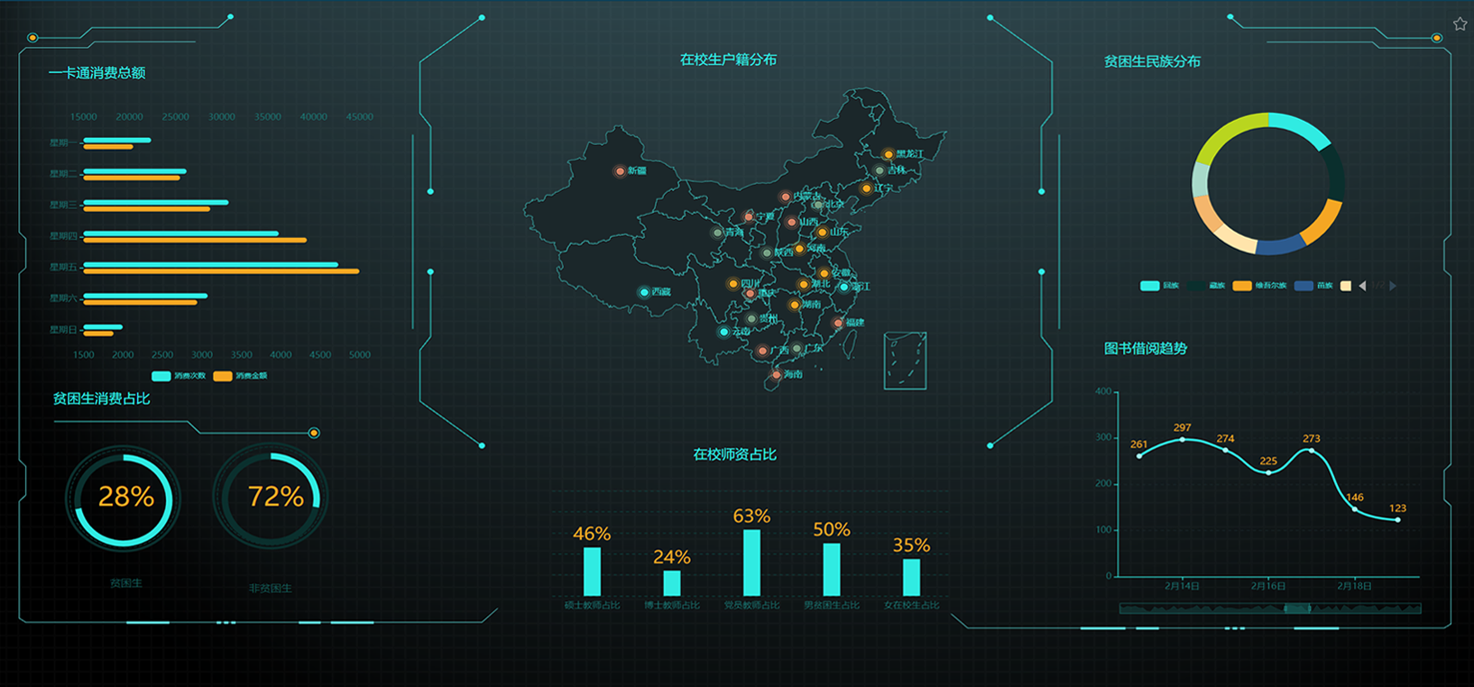 ◎ 提供丰富多样的数据可视化组件,并支持多种形式终端(PC、移动智能终端、微信、动态监控大屏)的展示技术;