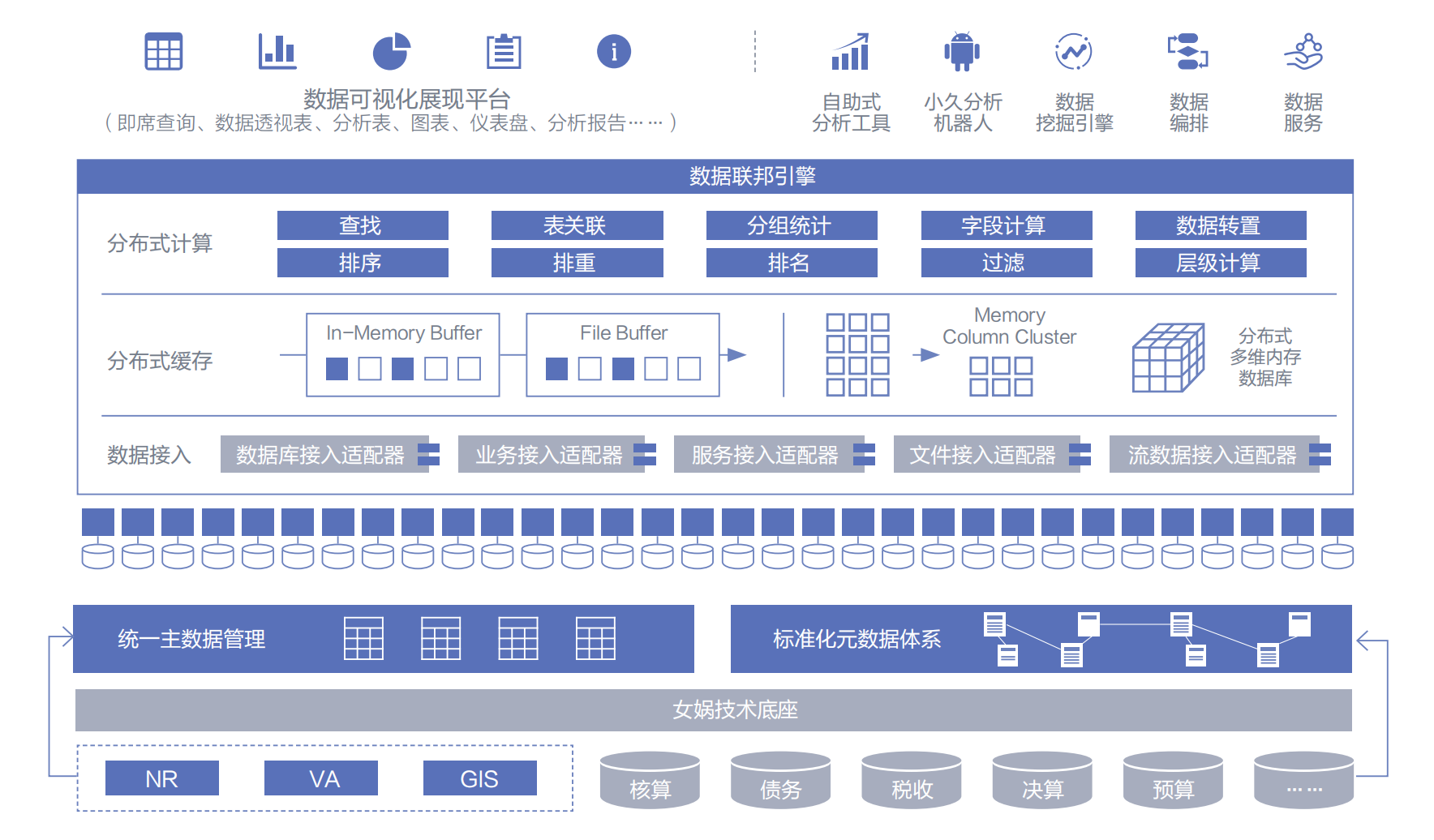 女娲大数据平台采用分布式微服务架构,基于统一的主数据管理和标准的元数据体系,基于内存计算的数据联邦引擎,实现统一的数据访问。女娲大数据平台可以无缝对接PG 各业务产品,也支持多源外部系统接入,实现企业/部门内外部数据的大数据应用。