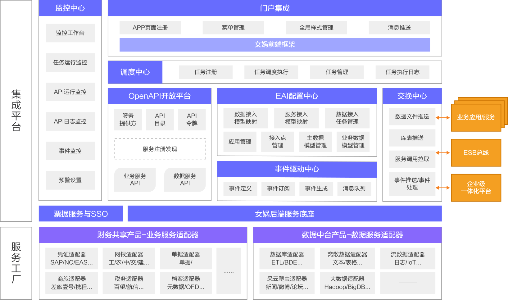应用系统集成从层次上可以划分为界面集成、流程集成、功能集成和数据集成。女娲平台均提供了全面支持: