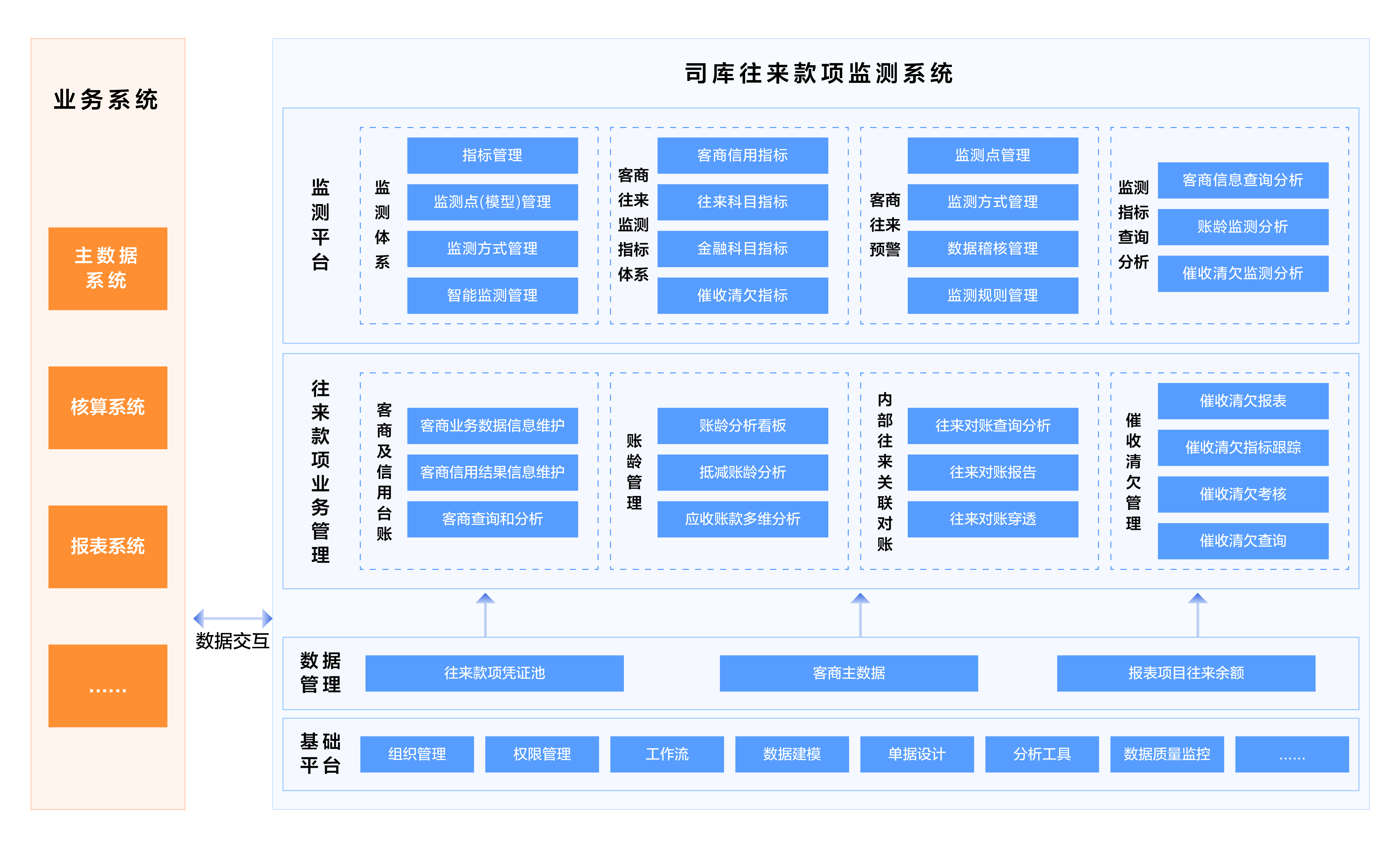 以司库管理理念为引领,集成各类核算系统作为数据源,建立往来款项凭证池,搭建客商及信用管理、应收应付款项管理、账龄管理、催收清欠管理、监测预警、综合查询分析等功能模块。