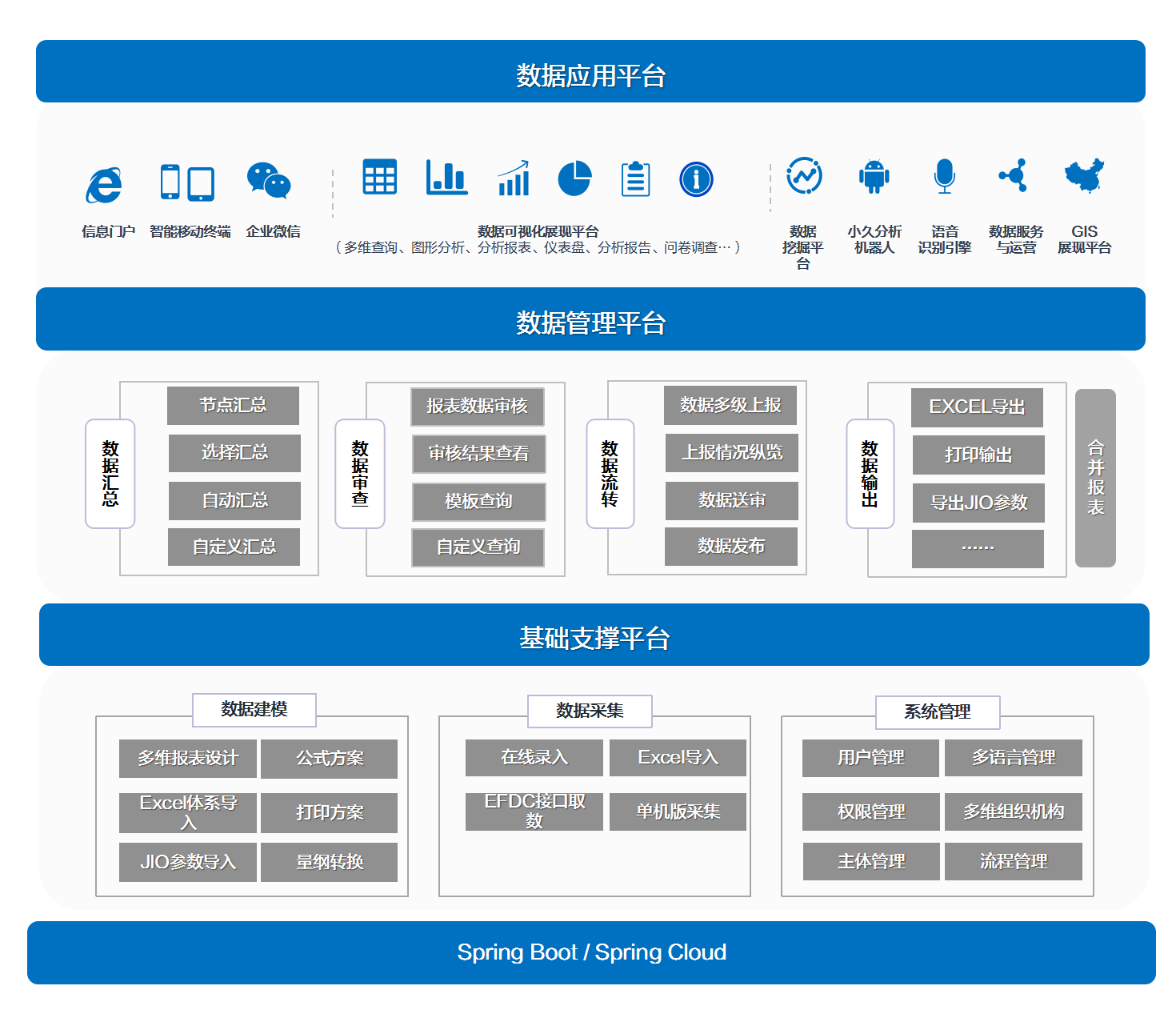 PG 综合统计管理系统基于Spring Cloud微服务框架,搭建了数据建模、用户管理、组织架构、权限管理等丰富的功能组件;匹配数据处理的相关功能,实现对数据采集、汇总、审核、流转、输出的管理需要;满足数据综合查询、分析展现、数据预测、分析报告等辅助决策功能。