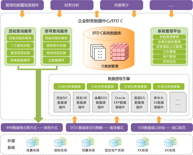 EFDC(Enterprise Financial Data Center,企业财务数据中心)套件是PG 公司针对企业财务数据整合开发的一款产品,它根据企业管理决策的需要,实现了自动从财务核算系统和相关业务系统抽取财务数据,并且数据的转换符合会计准则要求;EFDC套件在数据存储上既满足面向管理报表和信息披露的指标型数据的存储,也能满足结构化数据整合和访问的多维数据存储需要,在此基础上,EFDC还提供了完善的元数据管理功能,实现了从管理报表向基础财务核算数据和业务数据穿透查询功能。