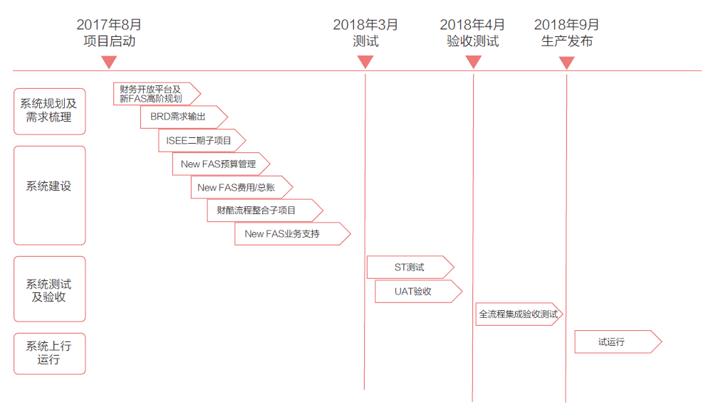 2017年8月由集团高层管理者的提议成立财务开放平台及FAS系统重建项目组,选择PG 软件作为咨询方及信息技术顾问,调派集团财务部、相关业务部以及平安科技项目组相关人员,在深圳平安总部集中办公,整个项目建设进程如下: