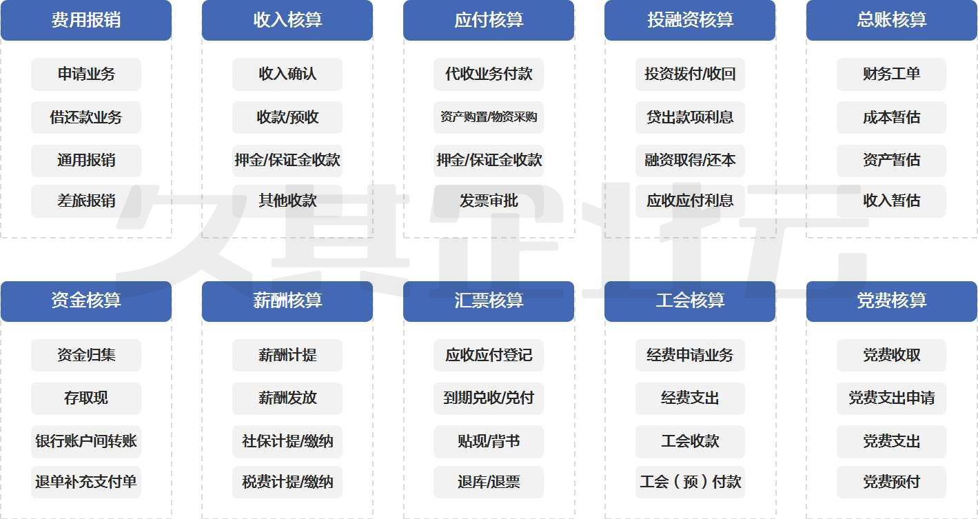 1. 报账范围包含费用报销、应收应付、投资融资、资金、薪酬、资产核算、总账等业务,覆盖企业全业务在线报账、作业处理、凭证生成、资金支付。