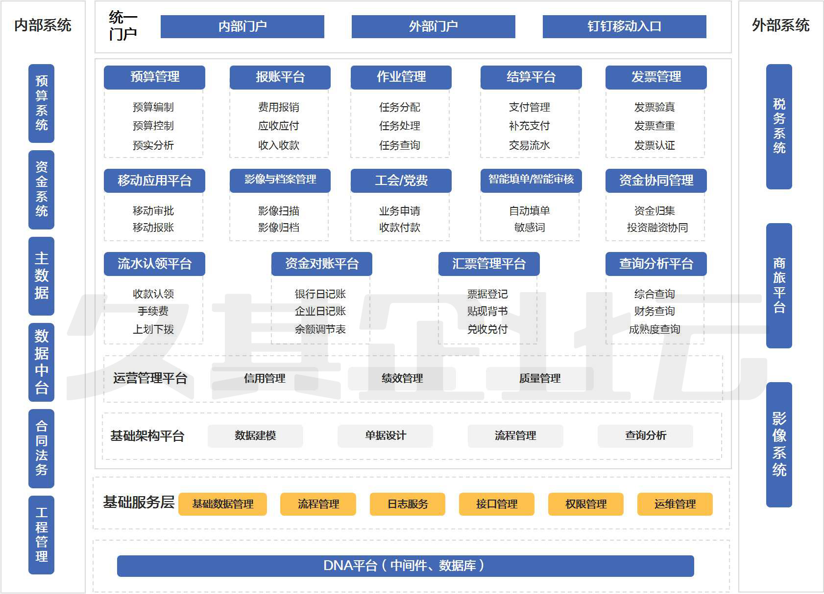 2. 集成包括全面预算,合同法务管理、工程管理、主数据、数据中台、钉钉、资金管理、核算、商旅等20个财务业务系统;实现业务数据自动获取、移动报账、移动审批、线上支付、自动记账等功能,打通内部系统,连接外部系统,实现数据的共享与互联互通。