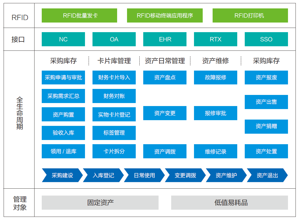 资产生命周期管理:从资产申购、增加(入库)、领用、调拨、变更、盘点和处置等各环节全过程的管控,需要工作流引擎将各个环节串接起来,资产管理包括固定资产管理和低值易耗品管理;