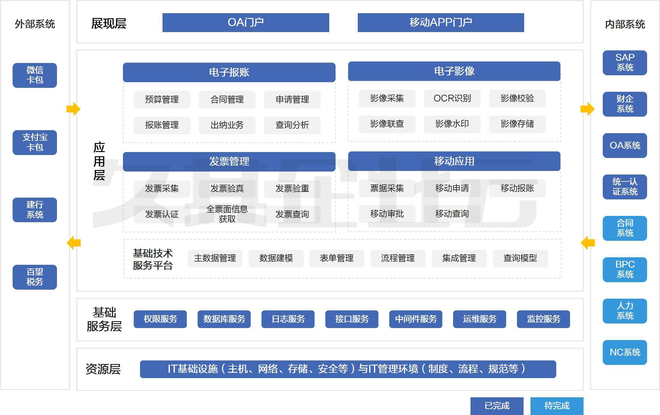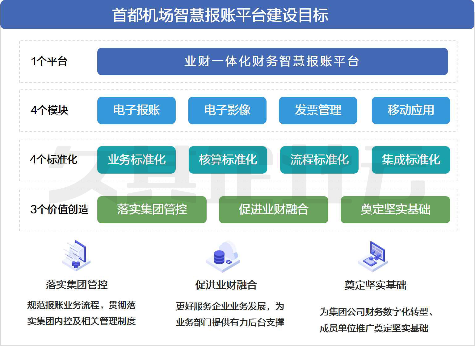 本期项目建设充分考虑智慧报账平台的全面性、先进性和可扩展性,对首都机场集团公司报销制度、科目体系、业务流程、附件规范、系统集成等方面进行了整体梳理和优化,结合电子报账、电子影像、发票管理、移动应用四个核心模块,实现报账管理的标准化、流程化、自动化。