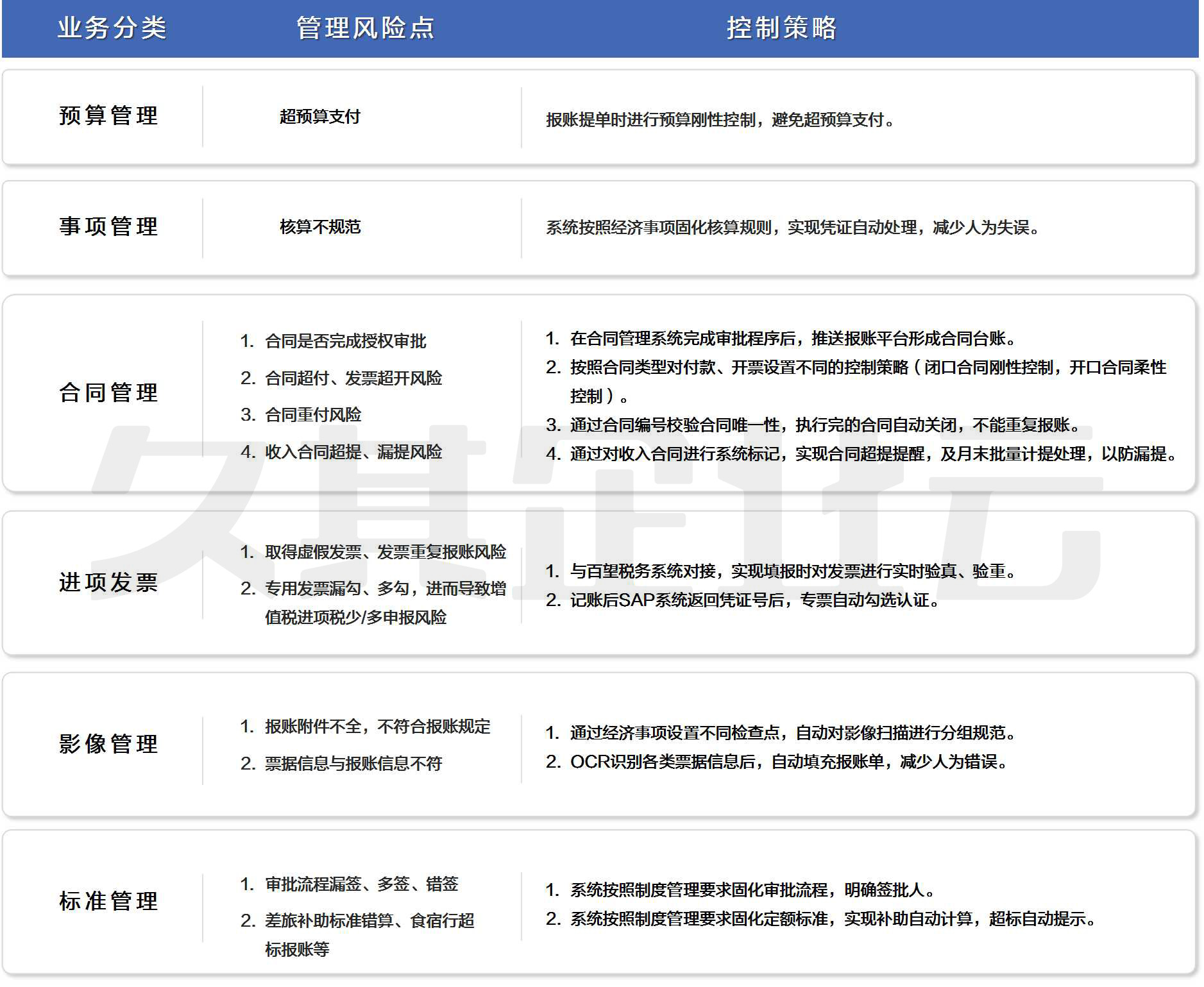智慧报账平台坚持报账内容事项化、事项映射财务化、管控内容规则化、规则内容系统化的落地原则,梳理各类管控事项,明确管理的风险点,制定相应的控制策略,满足企业精细化管理的诉求,降低财务内控风险。