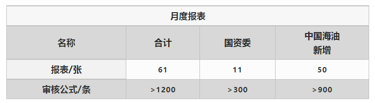 在国资委、财政部快报的基础上结合中国海油内部管理及上市披露等需求,梳理并设计了一套中国海油月度报表体系,实现快报、月报合并报送。