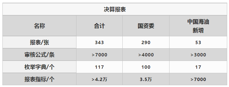 新增枚举字典规范了报表填报范围及填报内容,提高报表数据质量;新增校验公式来对决算数据进行预警,同时完善国资委决算审核体系,保障了符合中国海油决算审核体系的数据能够通过国资委决算审核体系。