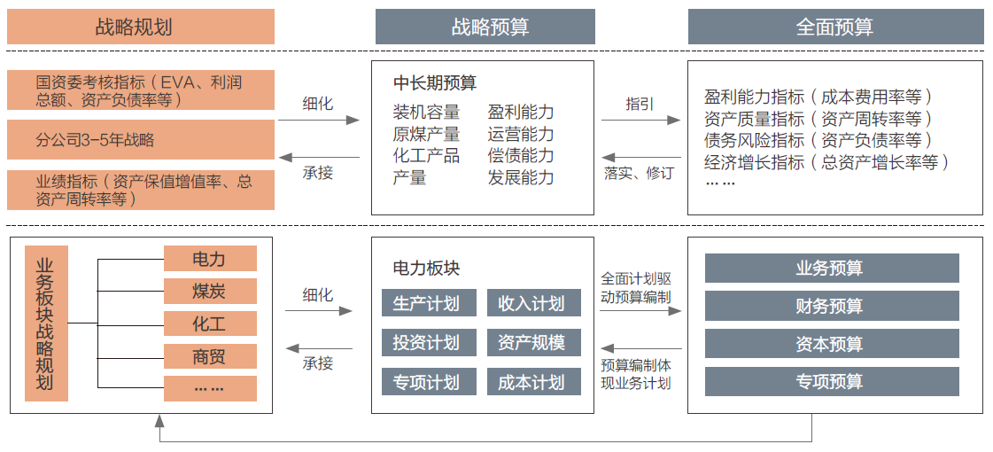 体系建立,建立了符合公司战略管理的战略预算体系,将既定战略通过预算的形式加以固化与量化,并将战略目标进行分解形成年度预算,通过预算实施、分析差距、反馈调整,不断强化自身特有的竞争优势,以达成既定的战略。