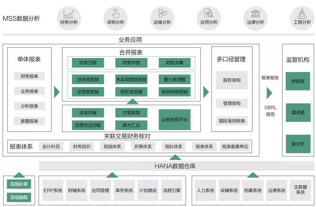 PG 软件在集中MSS系统建设中,承接了关联交易、合并报表、综合统计、数据分析、数据稽核等子项目,报表系统依托HANA数据仓库整合前端业务系统,实现企业内部数据信息共享,完成财务类、统计类报表自动编制、质量审核、多口径汇总等业务应用,有效满足对外信息披露和对内管理控制的要求,为业务部门和管理层提供实时准确决策支持信息。
