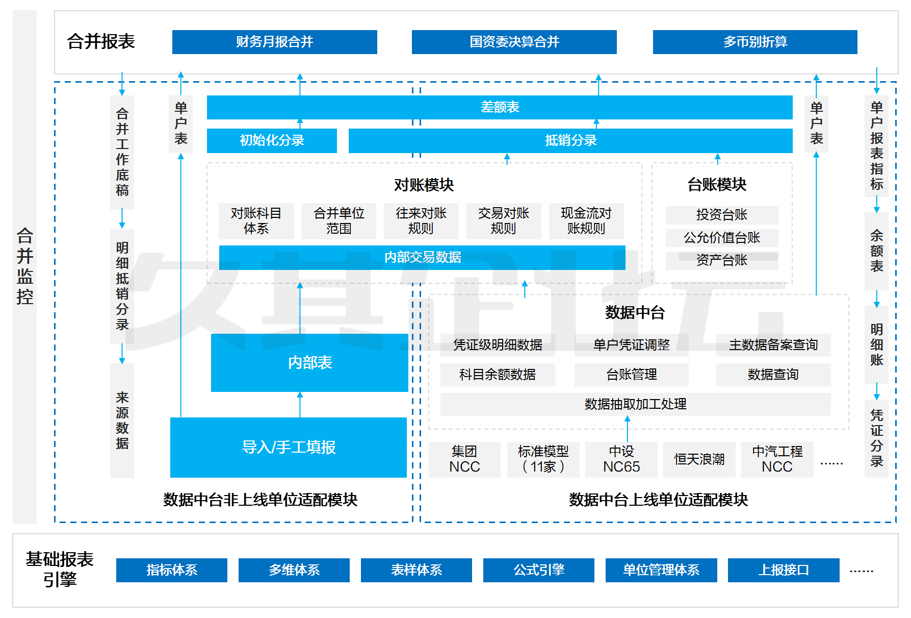 系统采用核算科目级抵销策略,依据核算标准化科目体系构建合并体系,与核算数据紧密结合,通过数据集市规范数据供应,极大的提高了系统自动化对账比例,同时通过台账功能减轻权益和交易类抵销数据采集工作,提升了合并数据质量及合并效率。