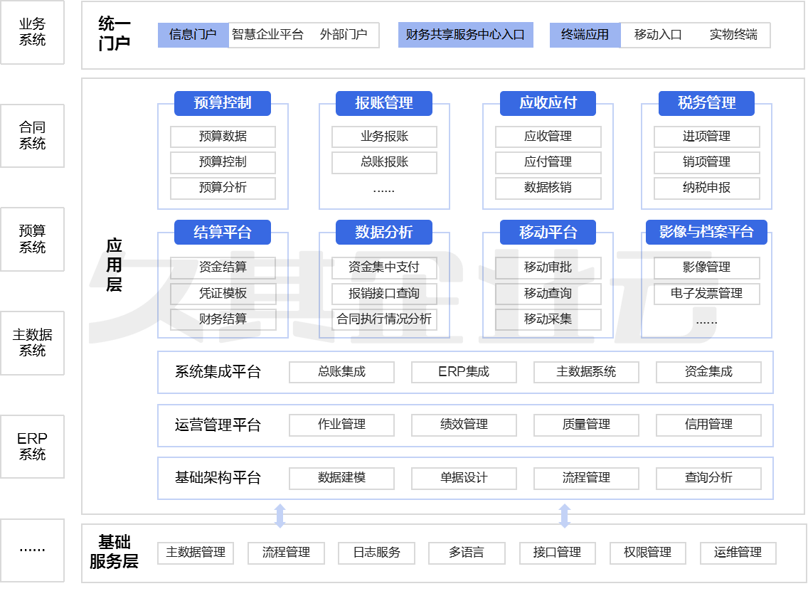 系统集成模块:财务共享服务平台作为三院的核心财务系统,集成三院多个业务及财务系统,主要包括:智慧企业平台、发票池系统、主数据管理系统、合同管理系统、ERP系统集成、预算管理系统、三院数据仓库、支付通及商旅平台等,实现财务信息处理的集中、共享、高效。