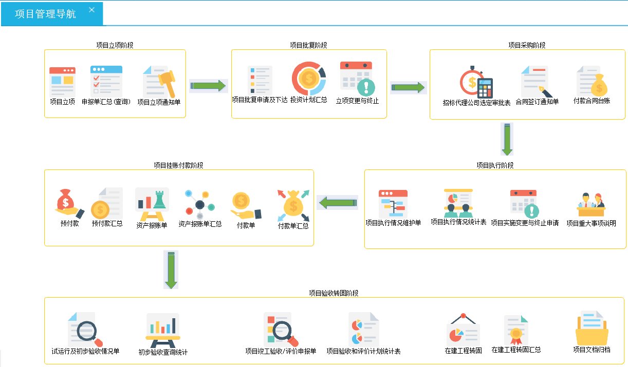 建立统一的项目管理体系,形成规范的项目管理流程,同时形成标准的投资项目资源库,实现信息数据共享。为提高项目的控制力和项目的精细化管理,在项目执行过程中,以项目目标为基线,实现项目过程管控,包括项目立项申报、项目批复下达、招标代理公司选定、合同台账管理、合同付款执行,资产报账、项目变更及终止申请,项目重大事项说明、试运行及初步验收,项目竣工验收及评价,在建工程转固和项目文档归档管理等进行串联,贯穿项目的整个生命周期。同时也通过项目管理建设,提供以项目为维度的整体数据分析,辅助企业决策分析。