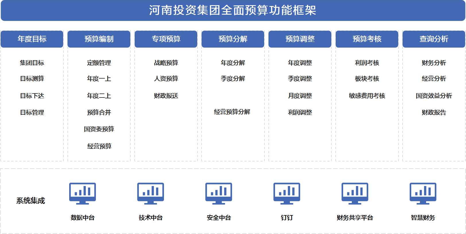 PG 在项目建设过程中持续贯彻河南投资集团“一流平台、两大延伸、三化合一、四项推动、五级应用”建设策略,助力集团建立全面预算管理体系,夯实战略预算体系,助力总体战略落实;建立完善的预算控制体系,面向财务系统提供预算控制信息;集成执行信息,自动化出具预实分析,辅助决策支持。
