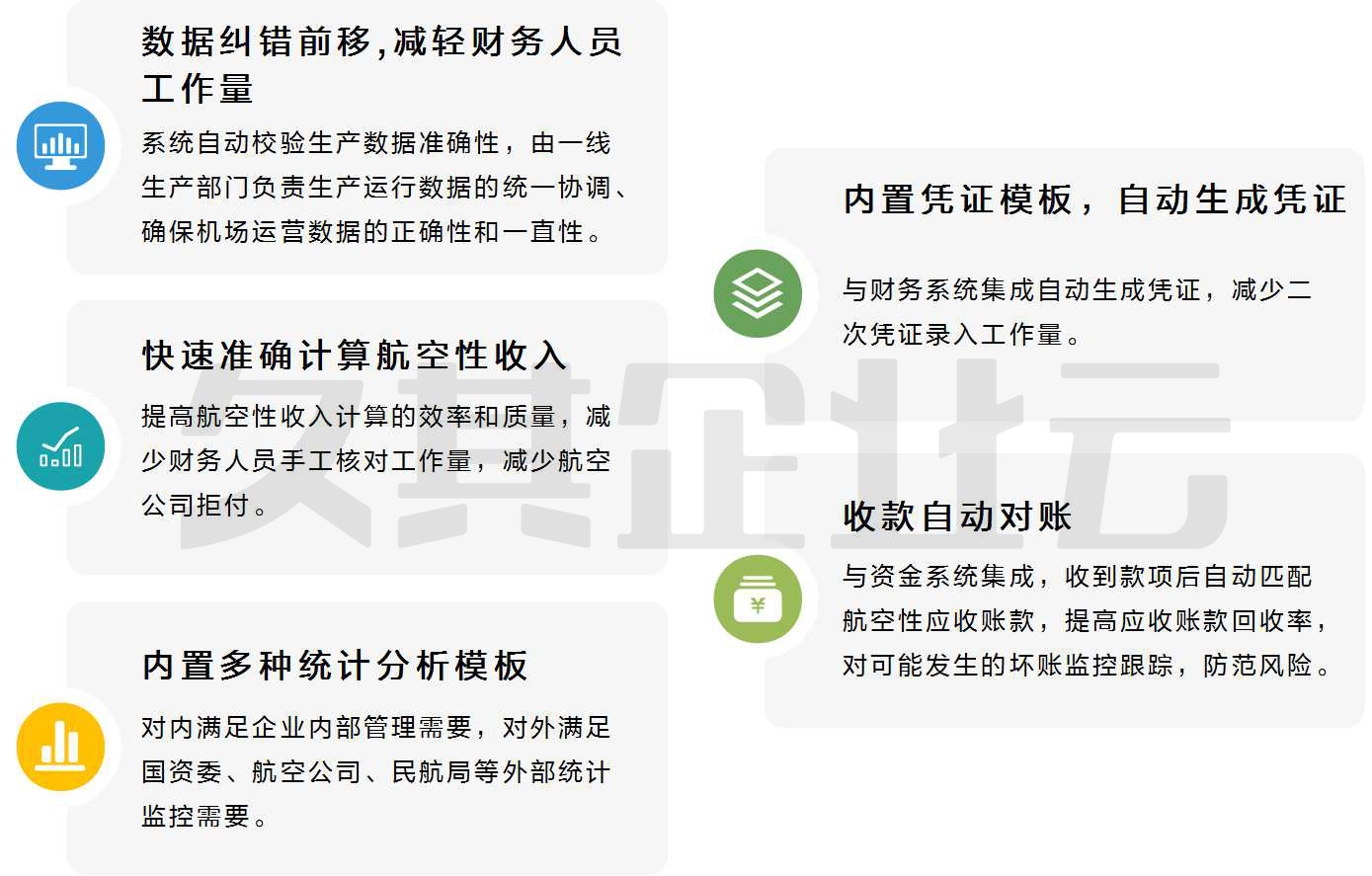 机场行业收入管理解决方案在信息化层面将围绕“航空收入”和“非航收入”打造六大应用体系,分别是主数据管理体系、业务数据源管理体系、自动结算管理体系、财务后端处理管理体系、决策辅助应用体系、业务活动支撑体系。