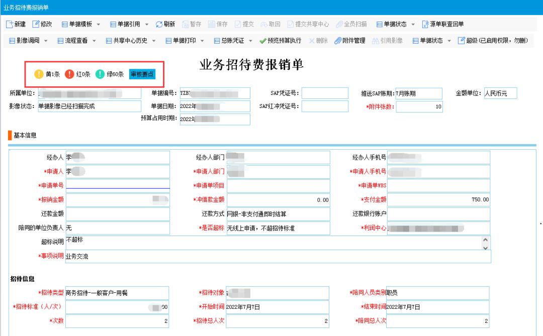 《业务招待费报销单》界面以红绿灯提示智能审核结果