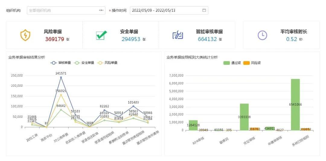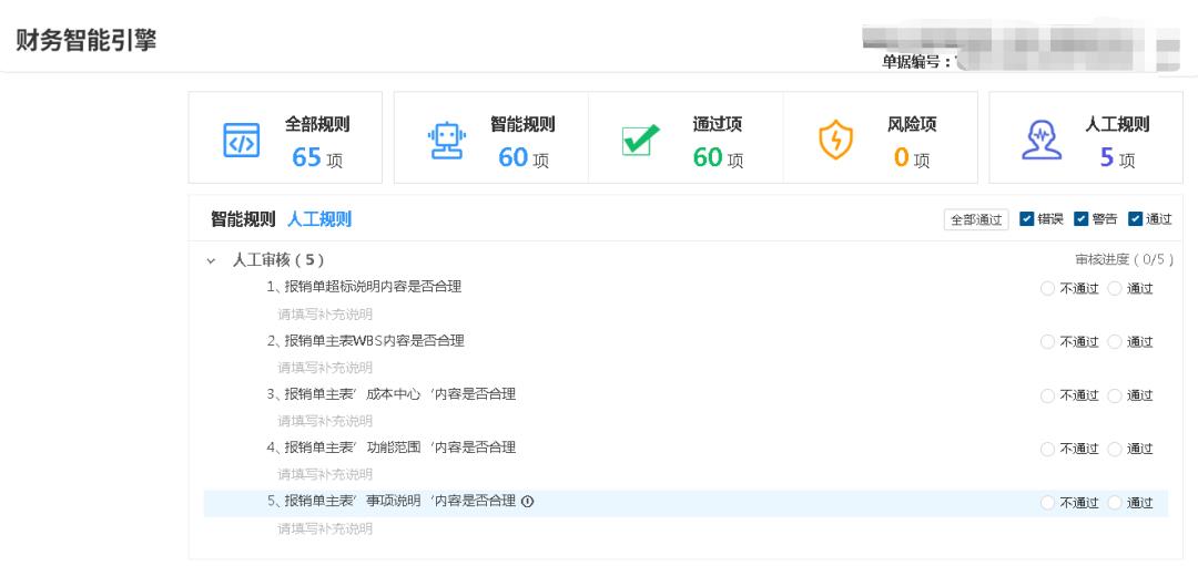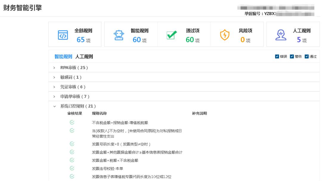 通过智能审核与人工审核相结合,降低财务审核成本。智能审核完全由系统调用智能引擎判断是否审核通过、是否风险点,而人工审核则列出待人工确认的审核清单、由财务审核后进行勾选确认并标注。
