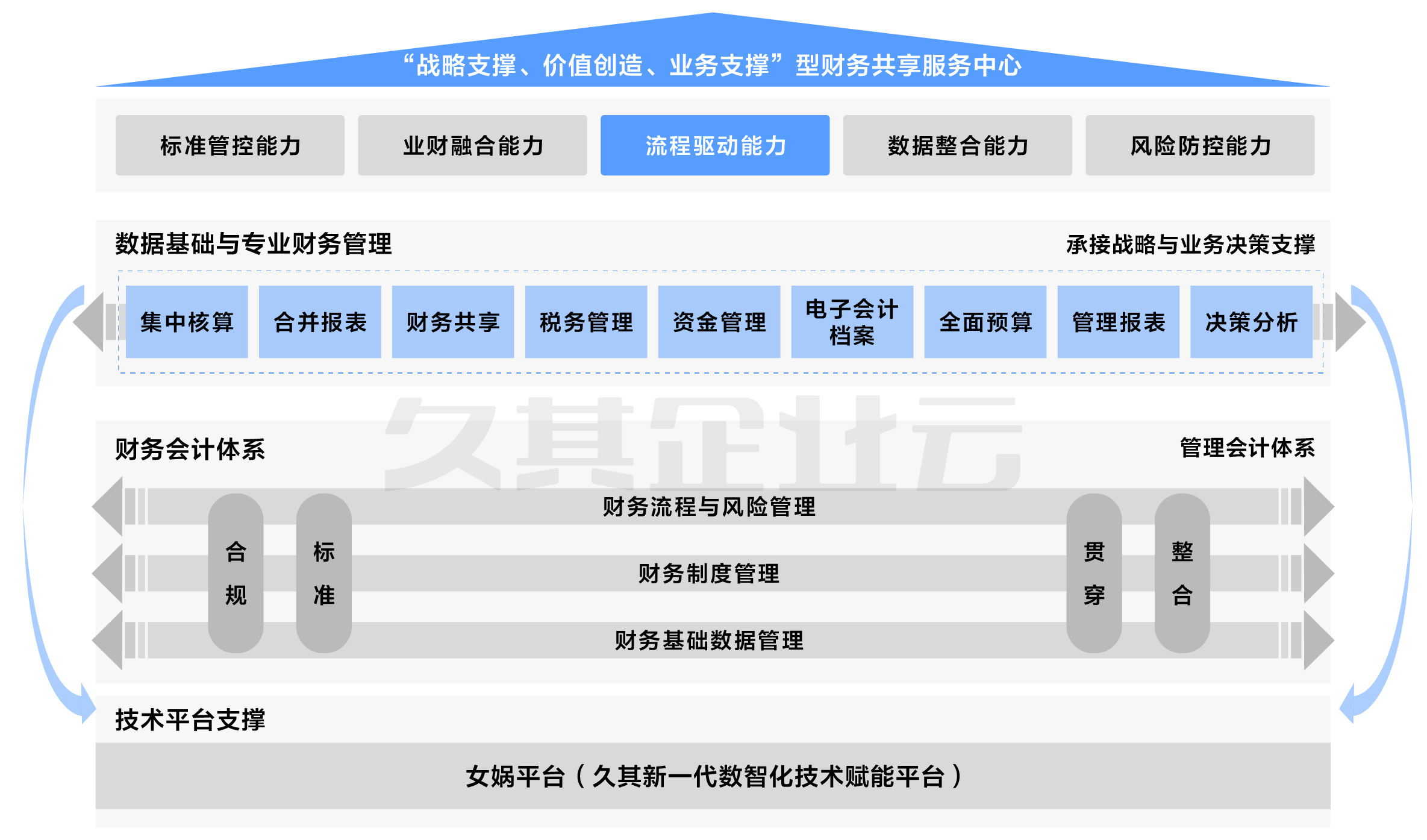 项目建设了核算管理模块、全面预算管理模块、财务共享报账模块、税务管理模块、资金管理模块、财务报表模块、电子档案模块、业务系统集成模块,构建了以价值管理为核心的财务管理体系,通过战略决策层、财务控制层、核算报告层、业财集成层系统建设,构建了由战略财务、业务财务和共享财务组成的三位一体财务支撑新体系。