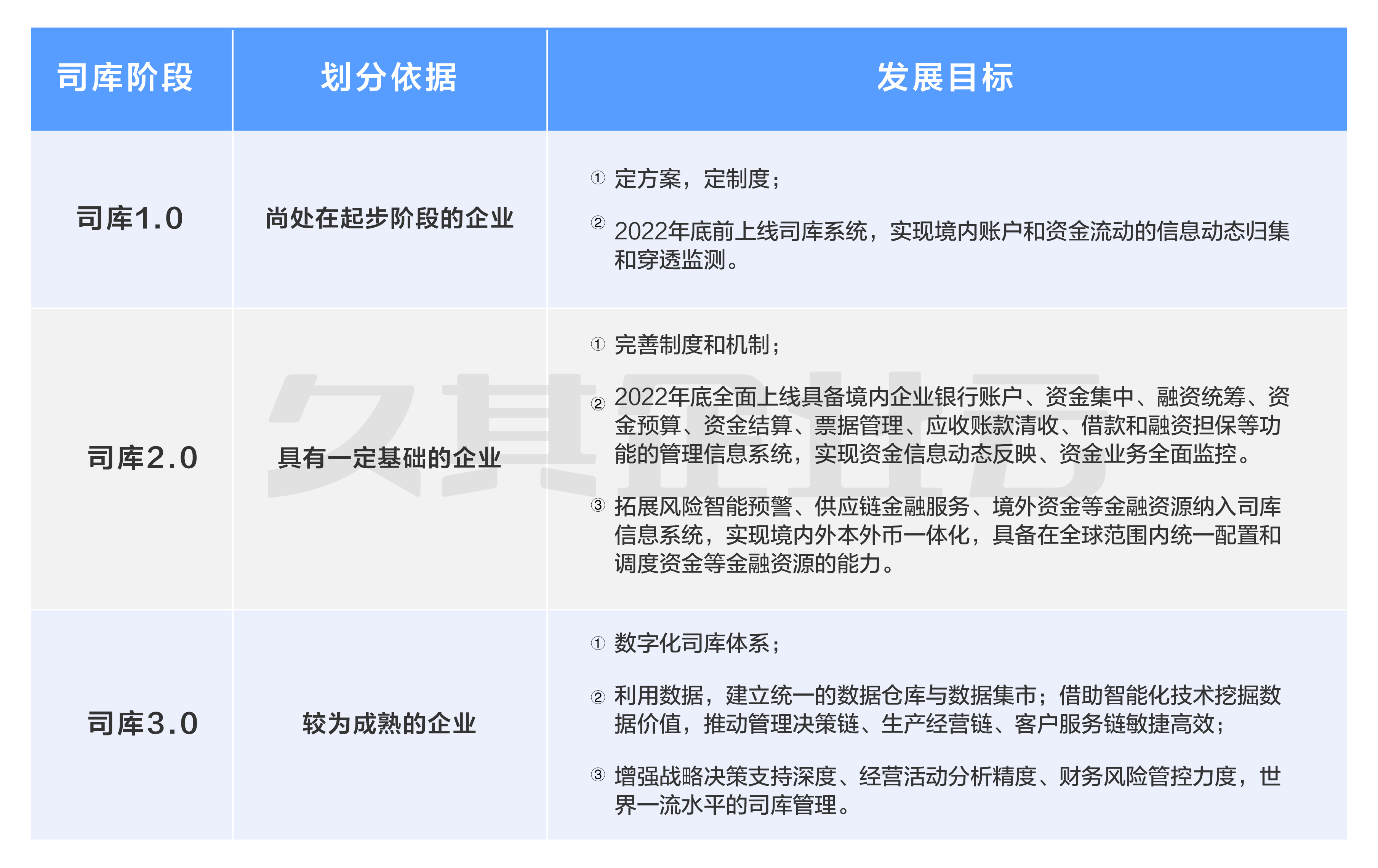 2022年,国务院国资委颁布了一号文《关于推动中央企业加快司库体系建设进一步加强资金管理的意见》(国资发财评规【2022】1号),对于司库体系提出建设要求。根据行业特点、发展阶段、管理水平,科学确定司库体系建设三个阶段目标和重点任务,三个阶段对应司库1.0至司库3.0: