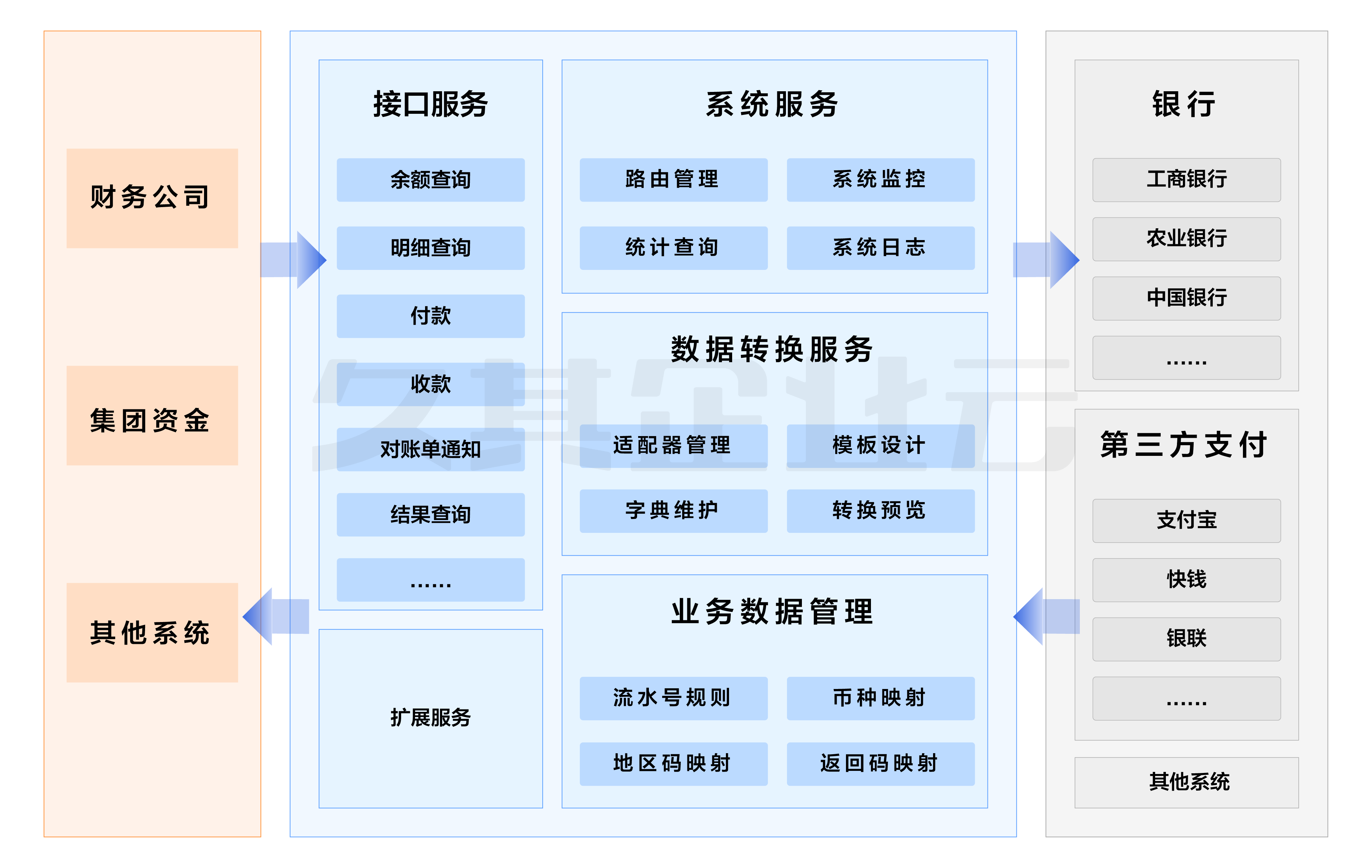 它由接口服务、数据转换服务、业务数据管理、系统服务四个部分组成,产品架构如下图所示: