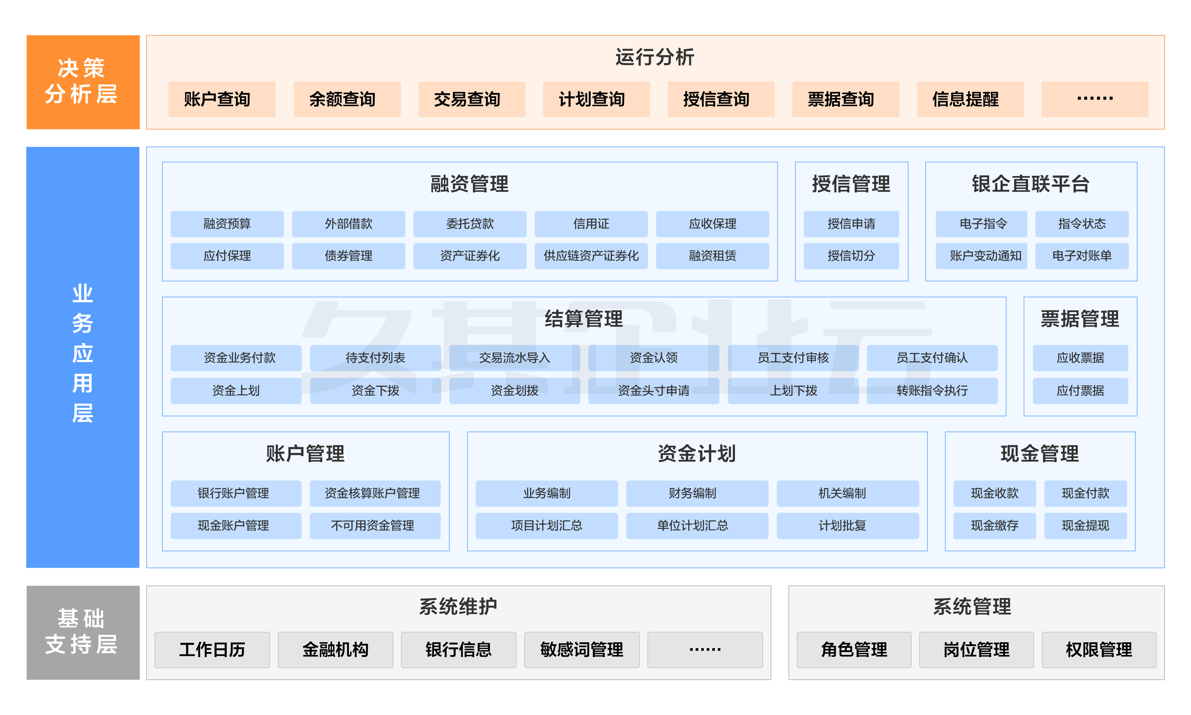 资金管理信息系统框架分为三个层面。包括基础支持层、业务应用层与决策支持层。其中业务应用层包括账户管理、资金结算、票据管理、现金管理、资金计划、融资管理、授信管理与银企直联平台等内容。