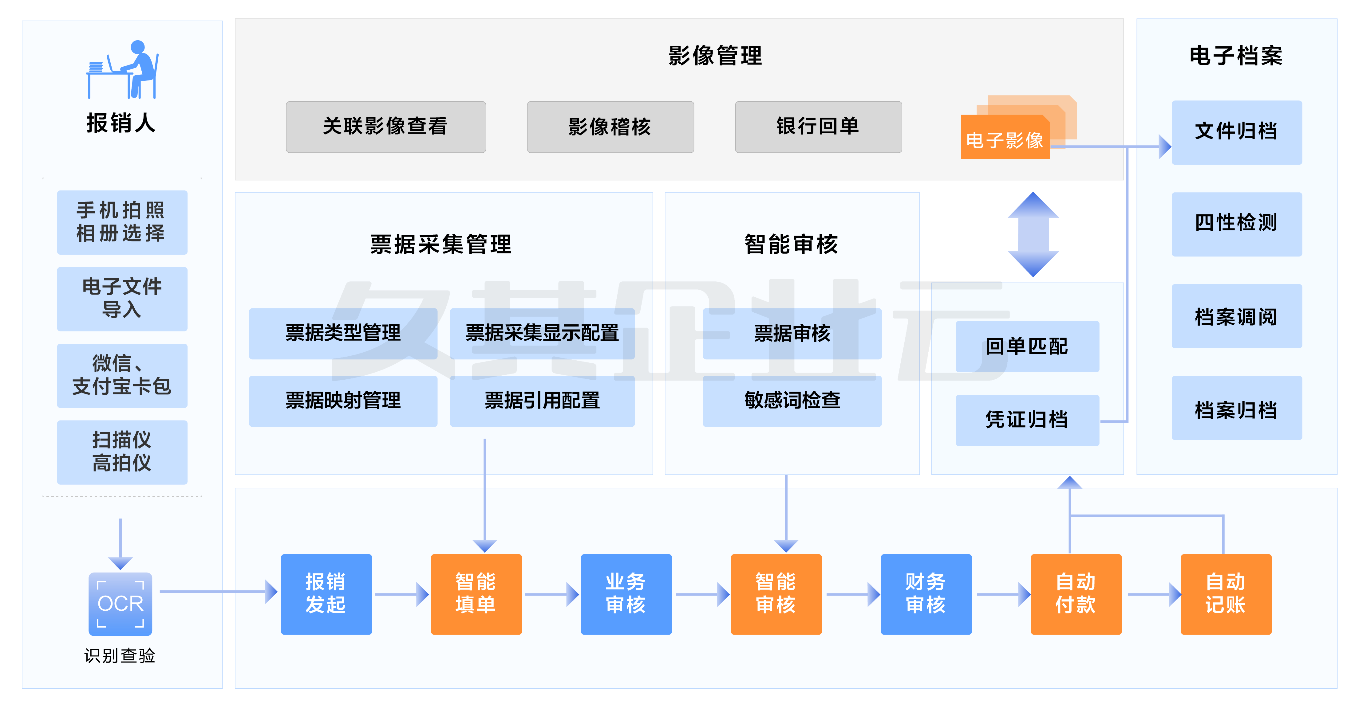 以常见的报销入账流程场景为例,电子影像的全景应用如下图所示: