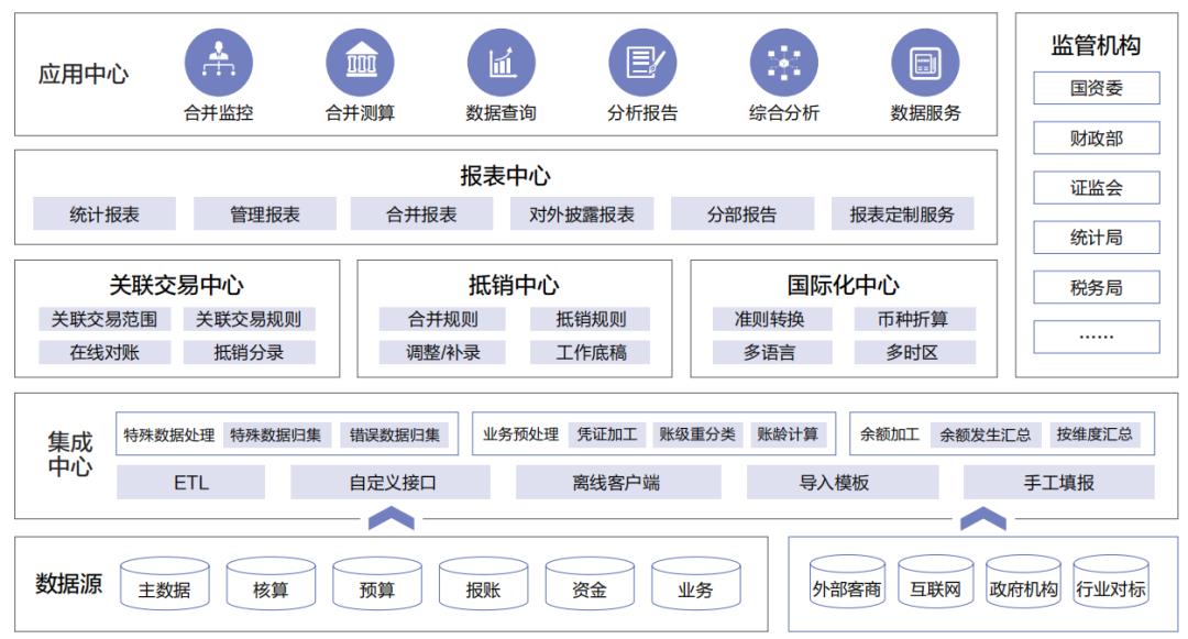 PG 合并报表产品以提供精准、合规、高效、共享的多口径财务报告为目标,满足内外部监管诉求的同时,注重提升企业数据治理能力,成为集团管控及绩效管理的重要工具。产品核心功能包含集成中心、报表中心、关联交易中心、抵销中心、国际化中心以及应用中心。
