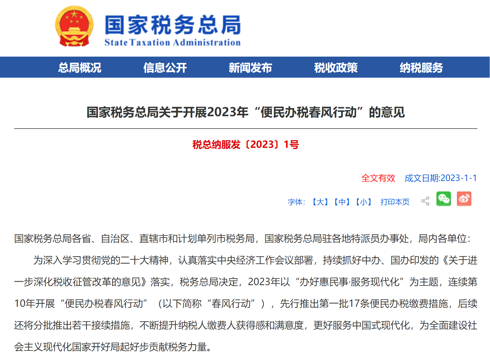 1、《国家税务总局关于开展2023年“便民办税春风行动”的意见》