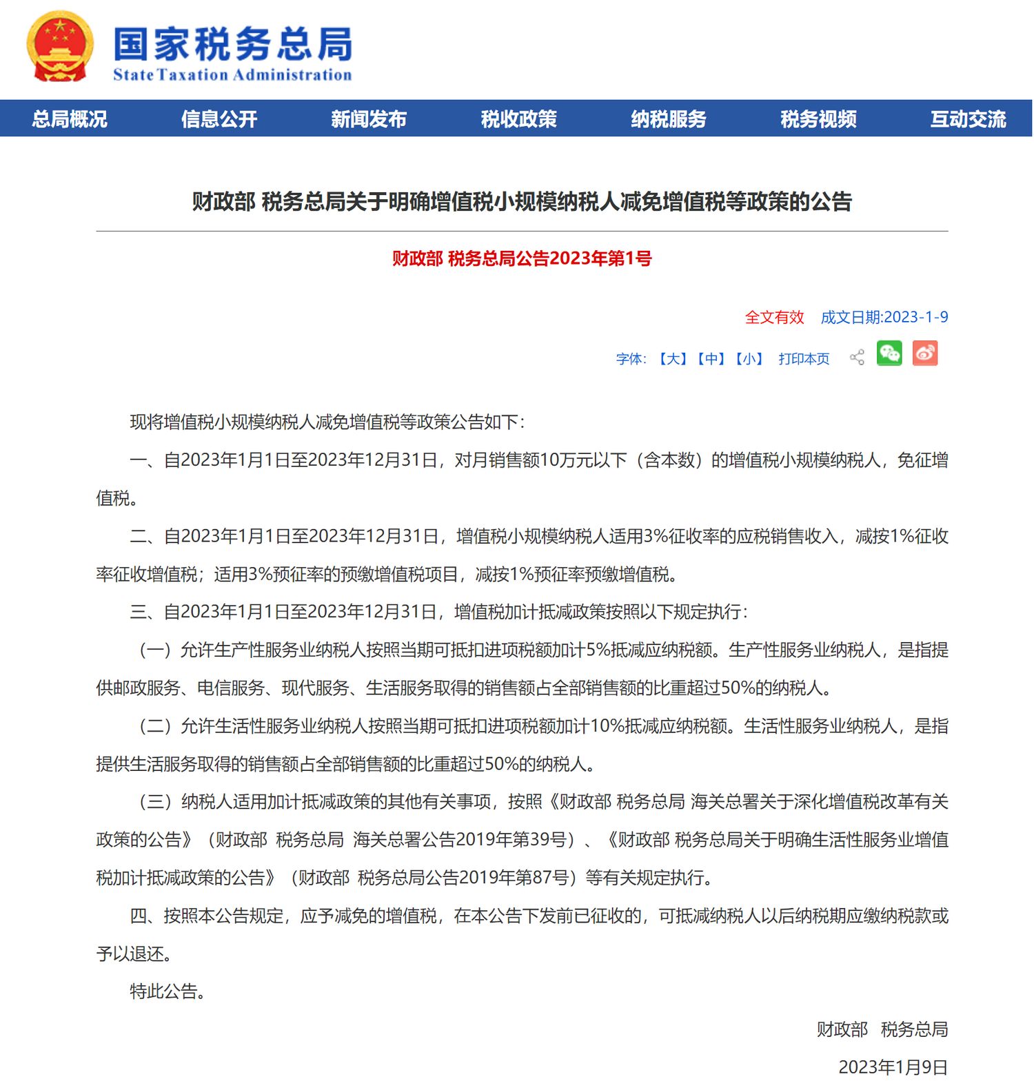 1月9日,国家税务总局发布了《财政部 税务总局关于明确增值税小规模纳税人减免增值税等政策的公告》(2023年第1号公告),明确了增值税小规模纳税人减免增值税等政策。