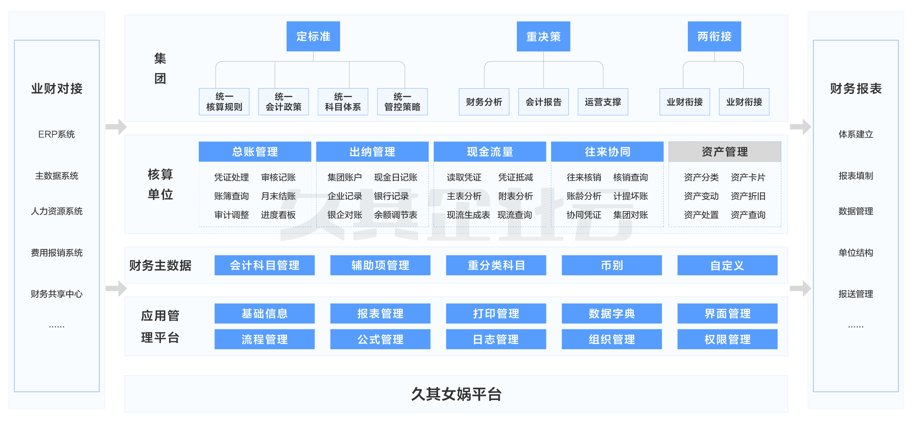 PG 集中核算管理基于自主研发的新一代女娲技术平台,将互联网、云计算、大数据等新兴技术与企业集团管控实践深度融合,面向大型企业集团,提供总账管理、出纳管理、现金流量、往来协同、资产管理等多个功能模块,满足企业集团多元化、跨地域、多机构、多组织、多币种需求的特性,实现集团和各分子公司财务集中核算,帮助企业实现管理转型升级。