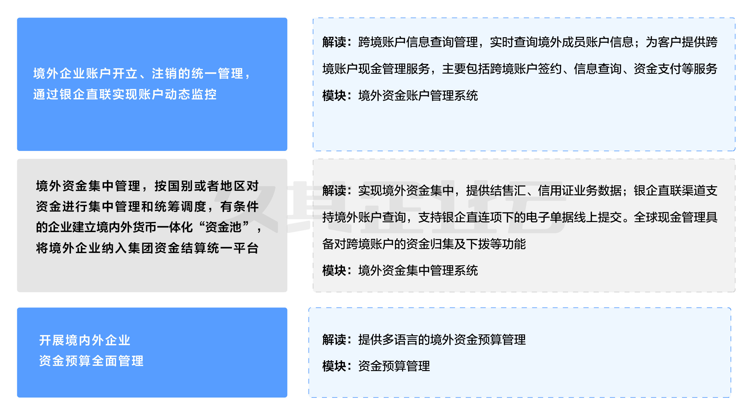 随着国际化发展的需要,不少跨国企业面临着资金管理体系不健全、制度执行不到位、支付管理不规范、信息化建设滞后等问题,境外资金管理诉求推动着跨国企业探索资金管理的新模式。其中,建立集团司库是一种非常有效的资金管理模式,可以实现对全球金融资源的动态管控,境外业务规模大的企业可以基于司库进行境外企业账户开立、注销的统一管理,通过境外银企直联等方式,实现对银行账户的全球动态监控,增加资金的价值创造,降低资金使用风险,助力企业更好地落实“走出去”战略。