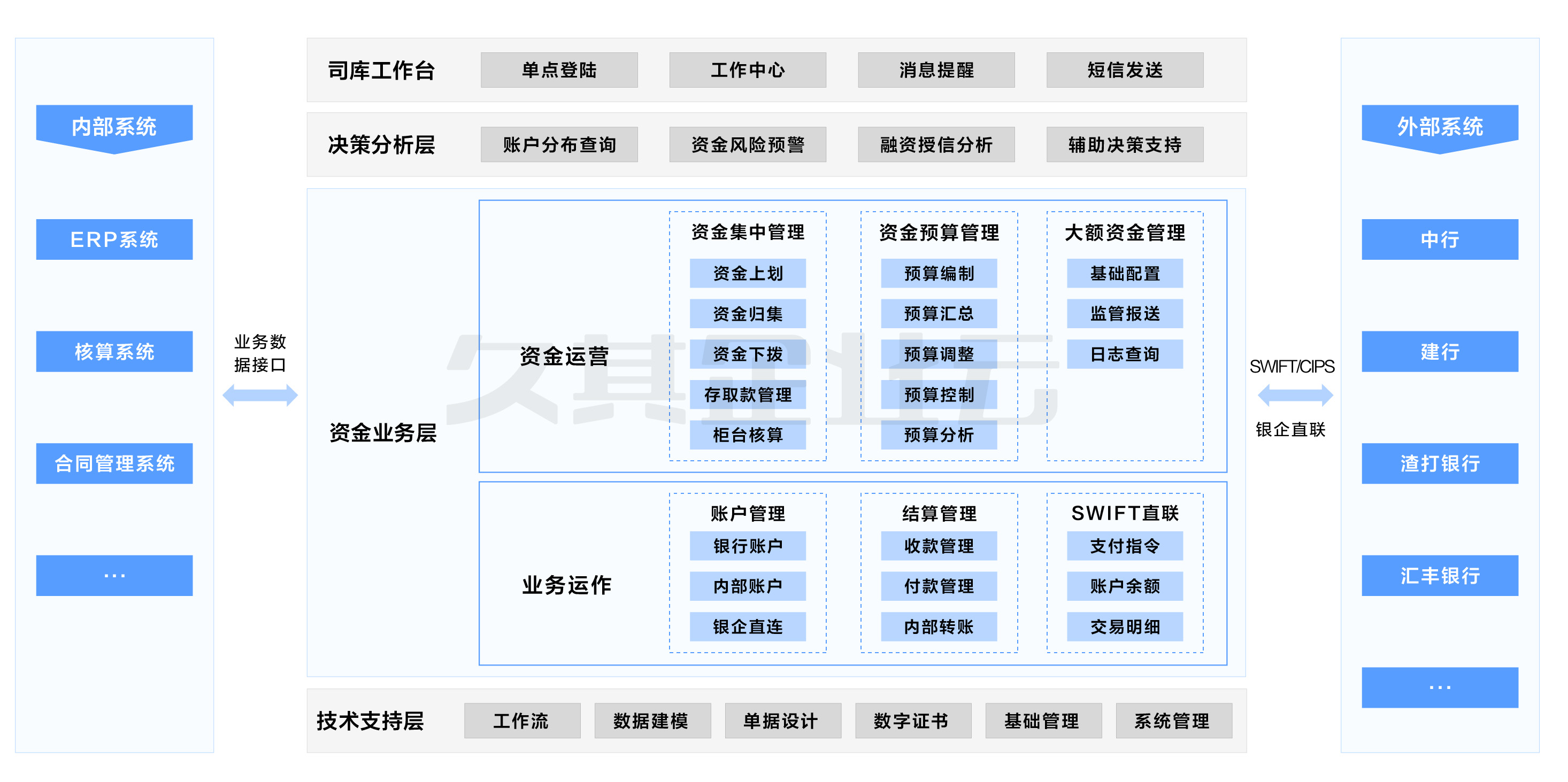 基于跨国企业境外资金管理需求和目标,PG 结合多年资金管理项目实践经验,打造了境外企业司库管理系统,系统由技术支持层、资金业务层、决策分析层与司库工作台构成,其中资金业务层包括账户管理、结算管理、SWIFT直联、资金集中管理、资金预算管理与大额资金管理等功能。