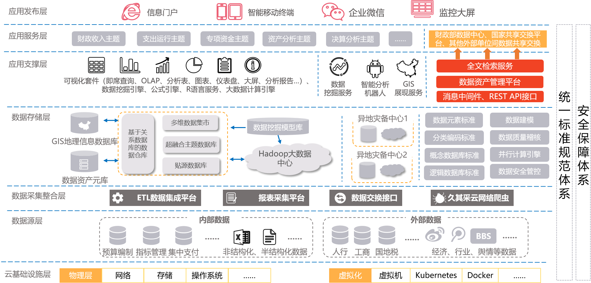 2、合理可扩展的技术架构及产品体系做支撑,总体打造一中心三平台的核心数据治理技术体系,满足财政数据的多元化采集、数据的存储管理、数据的共享交换以及数据分析挖掘的全方位需要。一个中心:财政大数据资源中心; 三大平台:大数据多元采集与处理平台、数据资产管理平台、大数据分析挖掘平台。