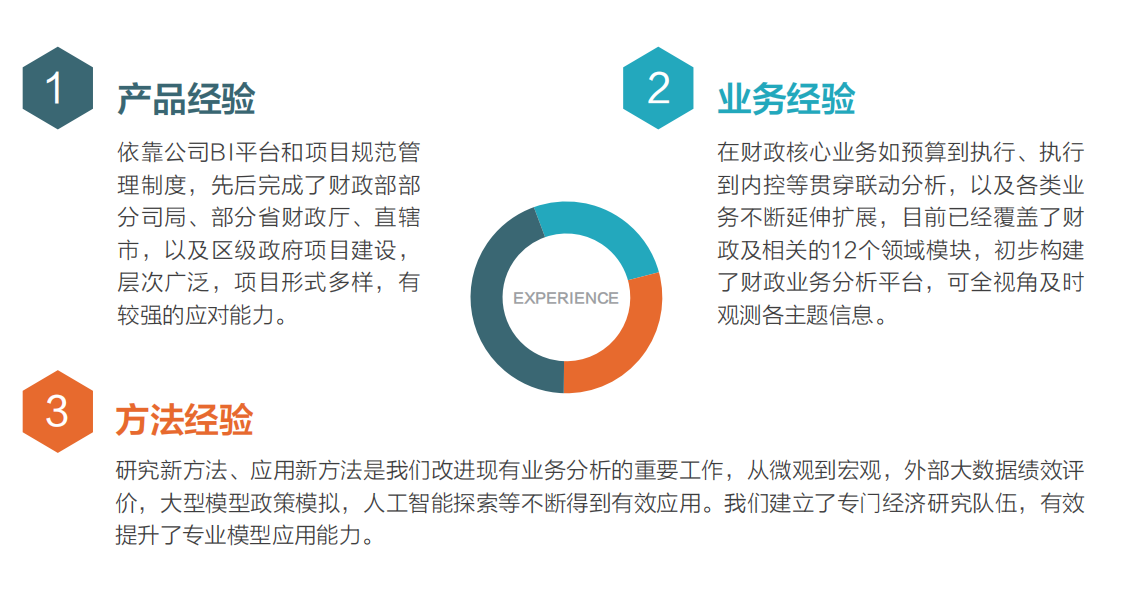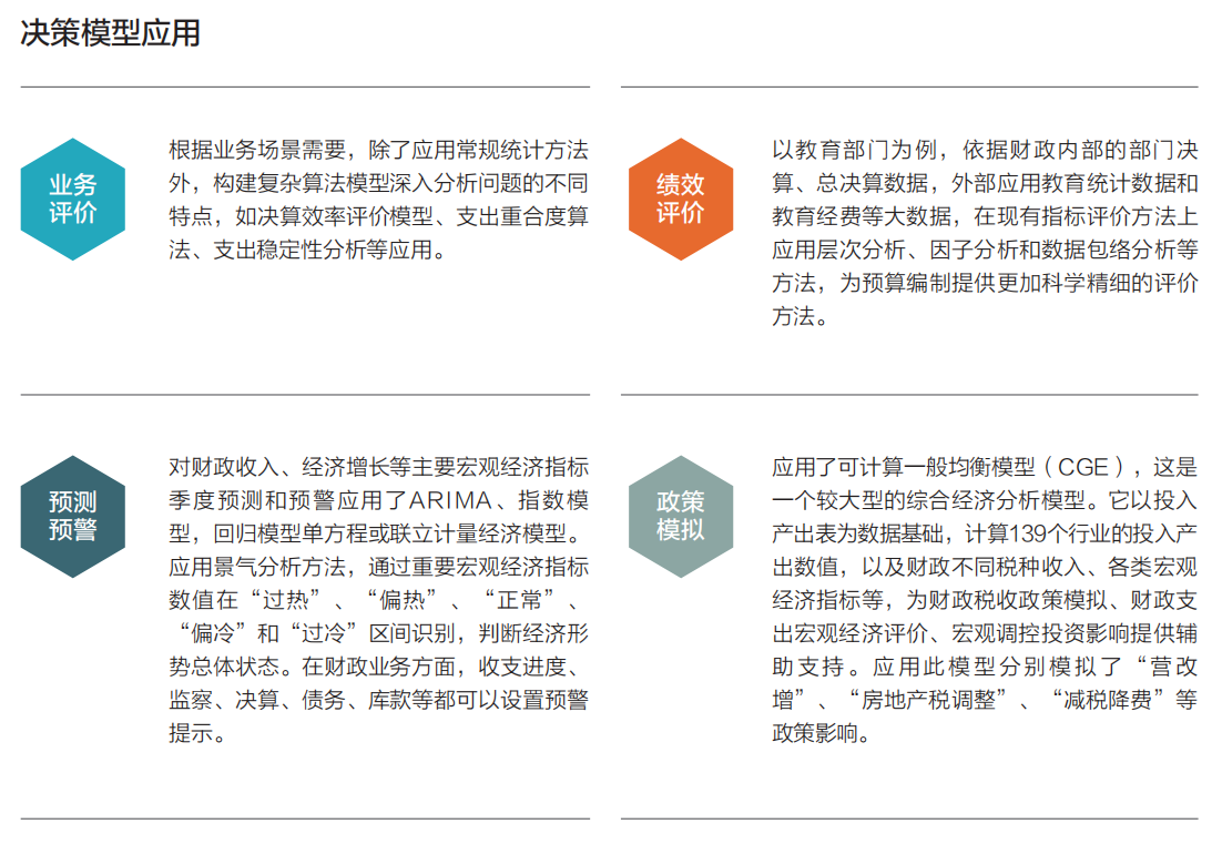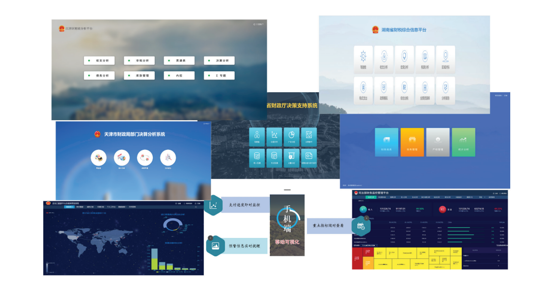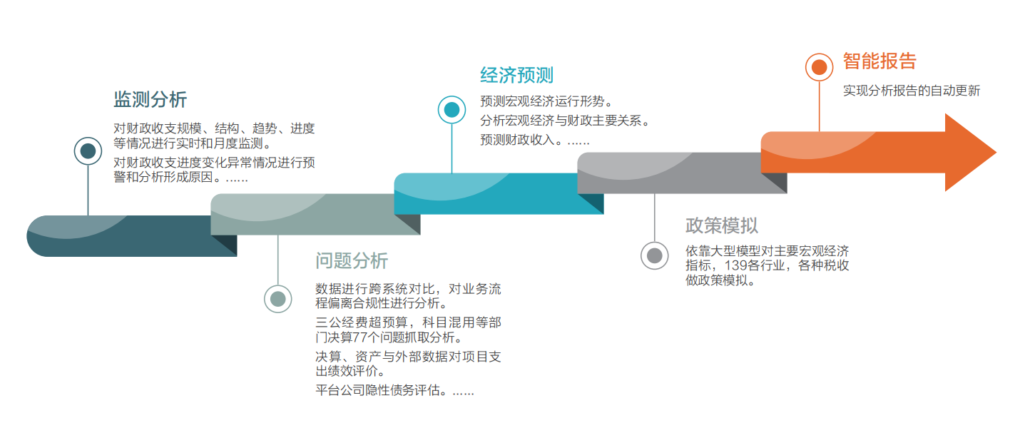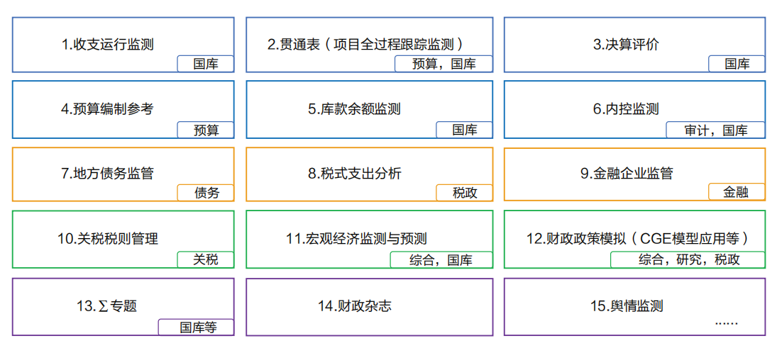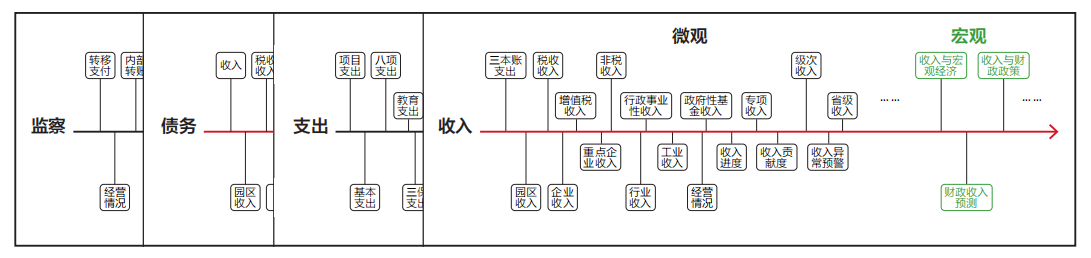 平台扩展到财政业务各主要领域:收入支出、预算与执行、预算编制参考、决算、库款管理、债务监管、国有金融资本监管、内控监管、税式支出、宏观经济分析、政策模拟以及其他专题等内容。在四个重点领域,收入、支出、债务、监察的分析,从微观延伸到宏观,实现微观实际操作与宏观方向判断相结合。