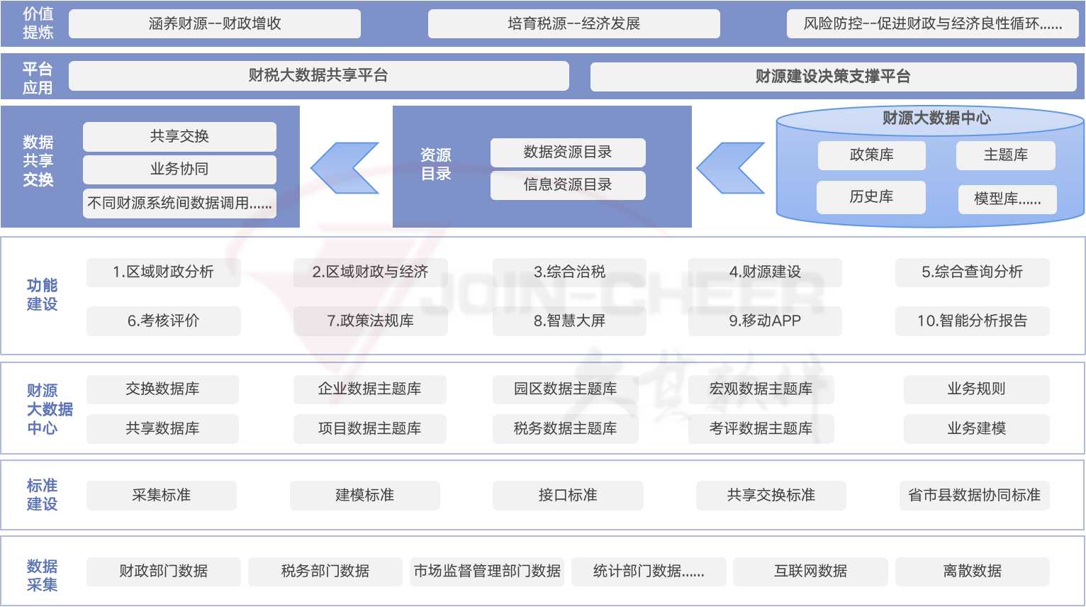 2、财税数据治理:以数据治理体系和数据资源规划为起点,以数据质量体系和数据资产管理体系为保障,以数据共享交换平台为抓手,构建统一的、跨部门的财税大数据资源库。