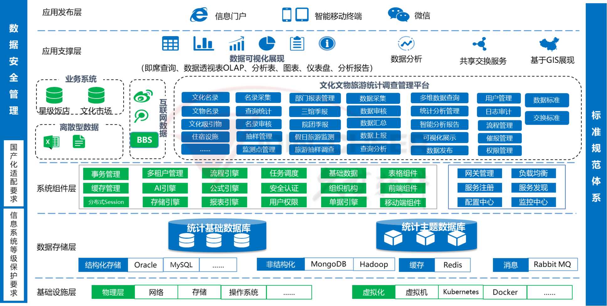4)数据资源管理中心:文旅数据资源中心的建设是对外进行数据共享、深化文旅数据应用、强化市场监管和风险防范预警的数据基础。系统建设文旅统计基础数据库、业务主题数据库,构建完善的文化和旅游数据资源体系,建立健全数据开放和共享机制,强化数据挖掘应用,激发数据要素价值,提升数据要素赋能作用。