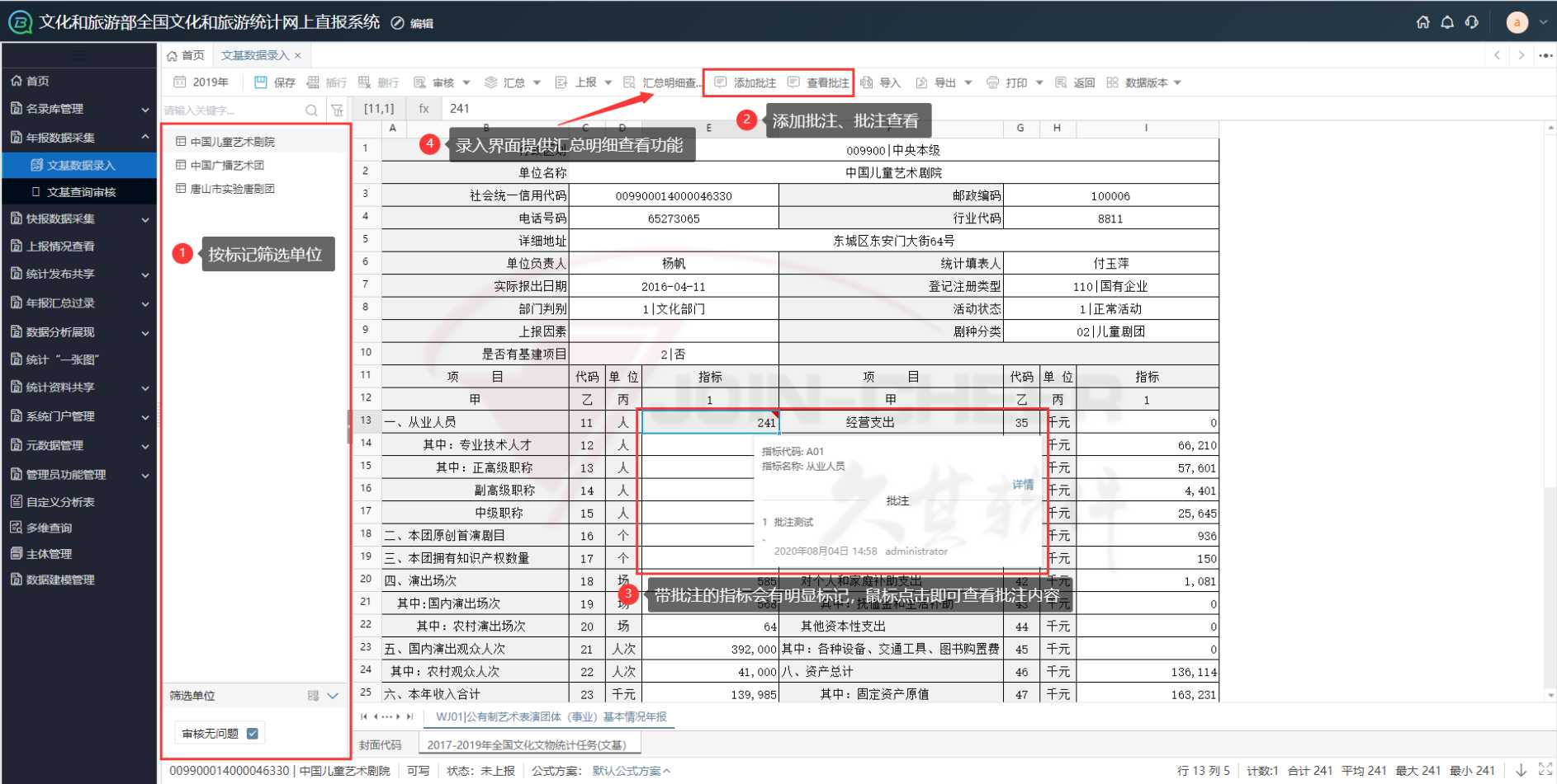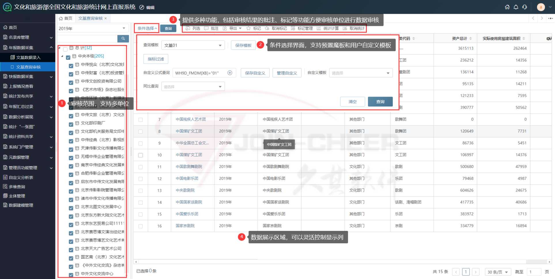 1)统计名录库功能:统计名录库是统计工作开展的基础,通过统计名录库的建设实现对艺术表演团体、图书馆、群艺馆、文化馆、文化站、博物馆、纪念馆以及旅游吸引物、星级饭店、城市综合体等名录信息进行的统一规范化管理,同时支持抽样调查功能,从而更好的支持统计调查工作的开展。