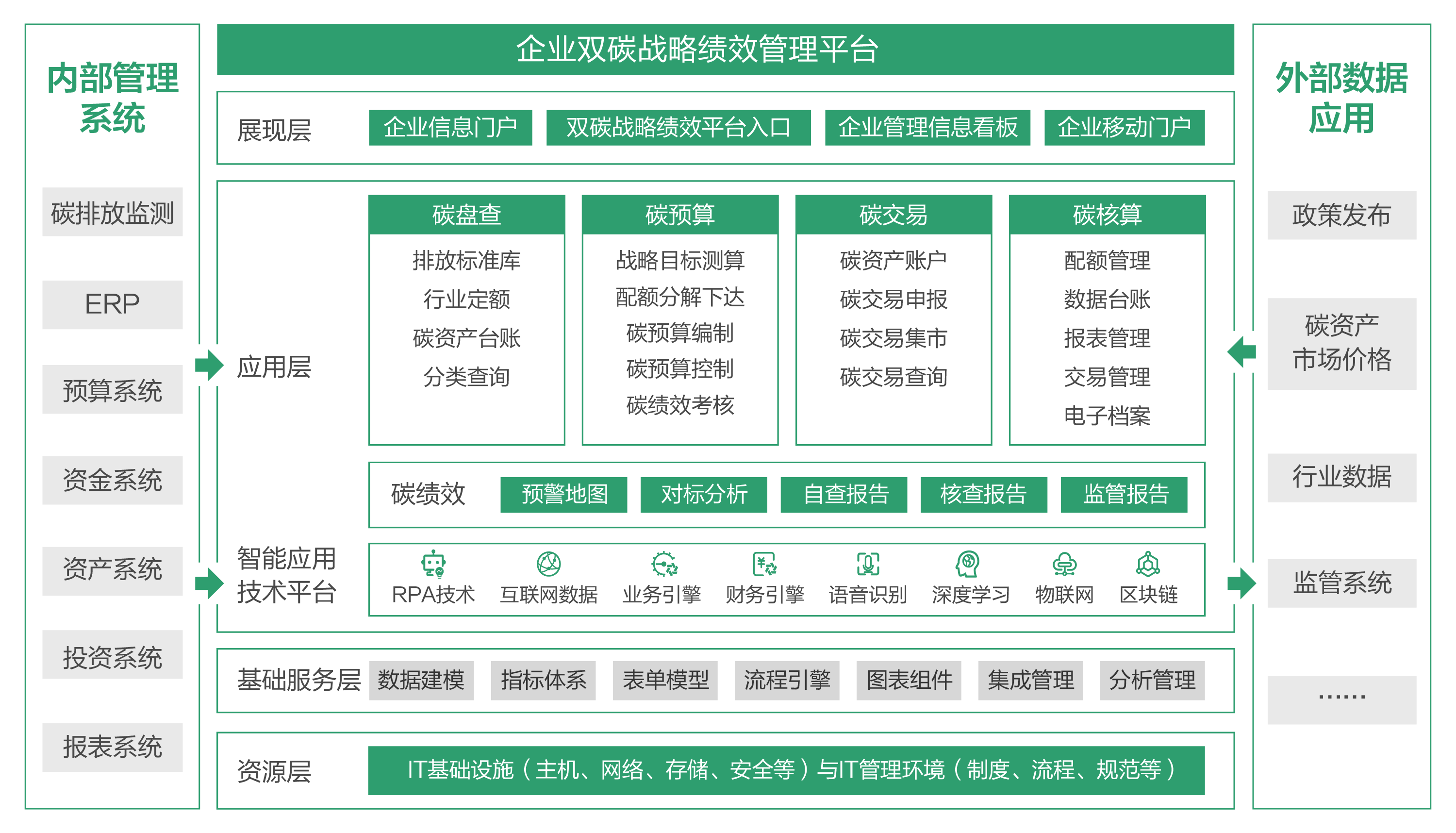 PG 碳资产管理方案基于女娲新一代管理平台,将低碳管理需求与企业整体绩效管理体系融合起来,构建涵盖核算、预算、决算、资产、资金、产权及碳管理等业务于一体的“统一服务于企业双碳战略”的绩效管理平台,自动形成闭环管理体系,推动业财融合,与低碳管理需求结合,助力企业实现“业-碳-财”一体化。