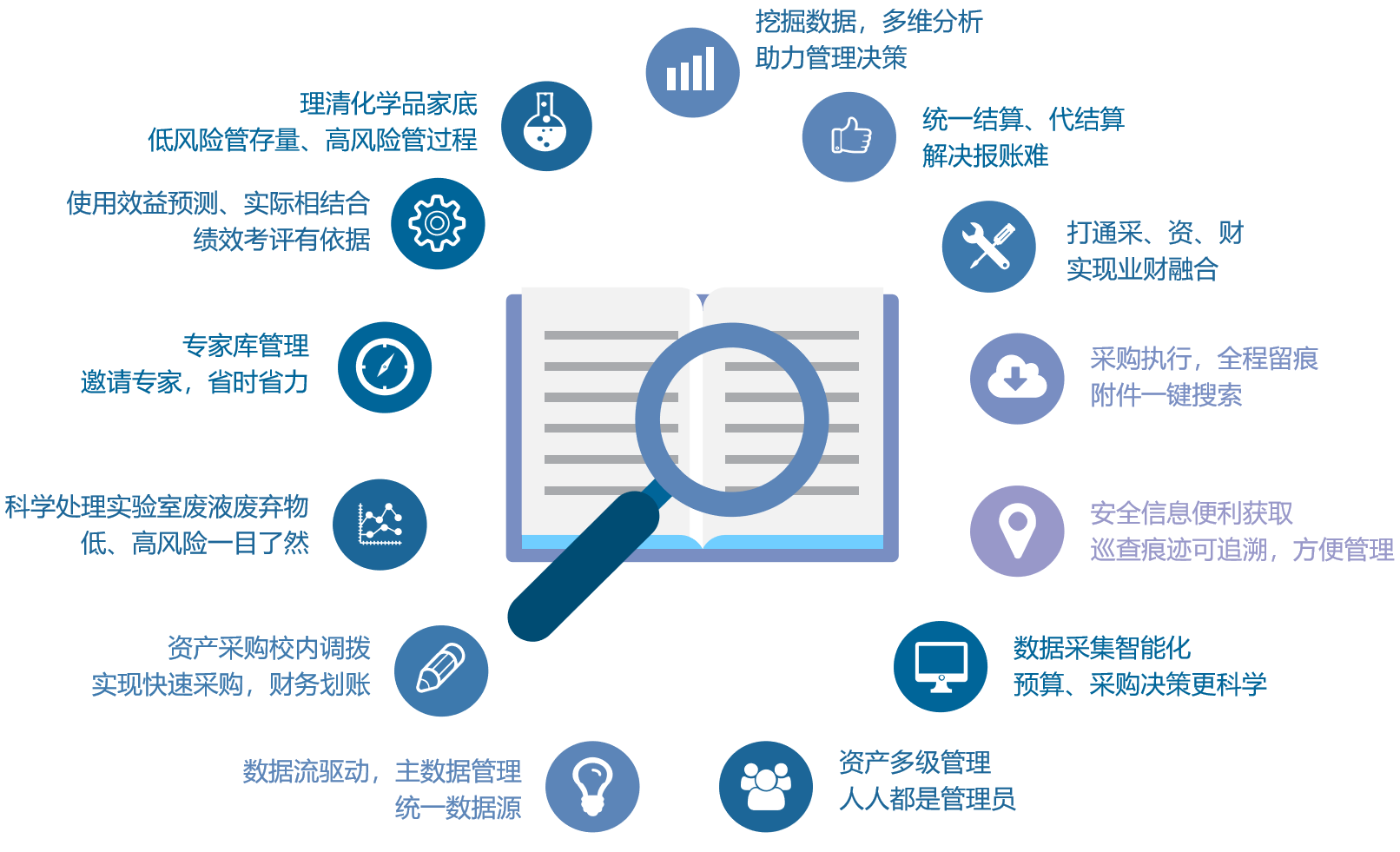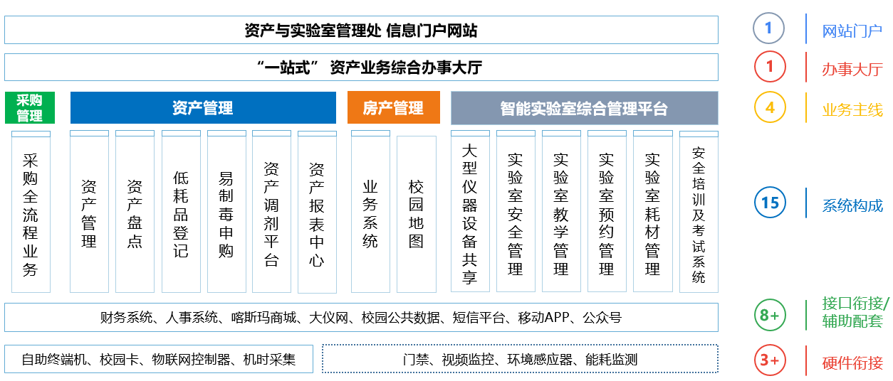 数据流驱动,主数据规范。“一站式”资产业务综合办理大厅涵盖采购管理、资产管理、房产管理、实验室综合管理等业务,配套短信平台、知识机器人、自助终端设备等软硬件辅助工具,既能支撑学校内部管理业务,也满足主管部门、财政部门对学校的监督管理和统计要求,将数据价值转化为决策价值,实现管理模式由数据管理模型到精准治理范式的全面升级。