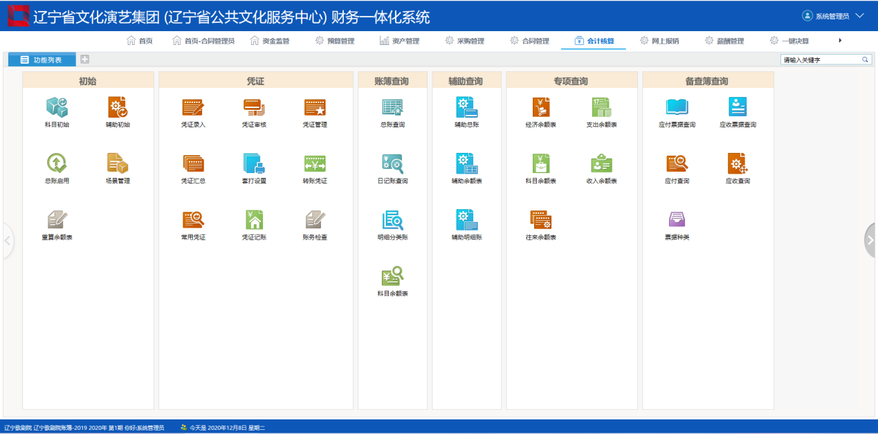 辽宁省文化演艺集团财务一体化项目,通过预算控制、会计核算、会计报表、财务监管等模块配合集团特有的“全面预算”体系,从凭证、报表、图表多维度对预算执行情况进行实时监督管控。