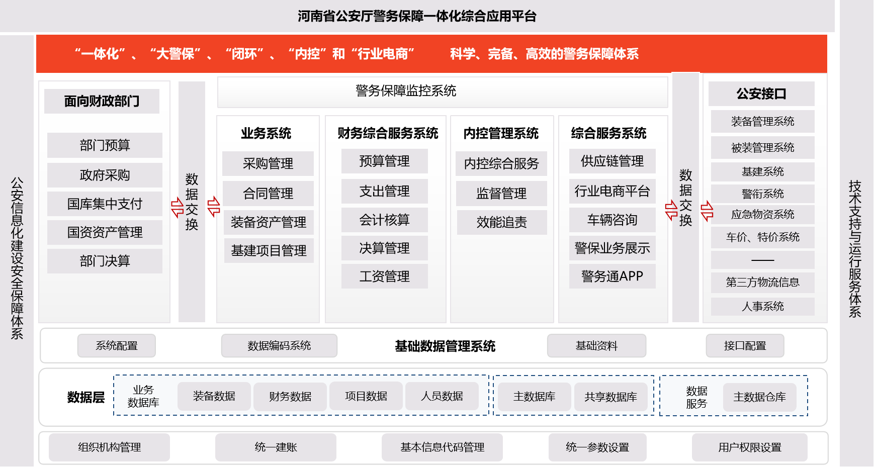 警务保障平台建设聚焦“集约化”打造智慧警保,紧贴河南公安警务保障的工作实际,以“一体化”、“大警保”、“闭环”、“内控”管理为理念,以“整合资源,信息共享”、“统一架构,业务协同”为原则,以业务流、资金流、信息流的数据共享与业务联动的业财融合为目标,以“互联网+”、物联网技术、电子商务、OCR识别等新的信息化技术为手段,以应用支撑平台为支撑,以警务保障业务全过程管理为基础的整体框架,以保障业务管理、财务服务、内控管理、综合服务、警务保障监控为核心业务主线,将警务保障运行管理新机制各环节之间控制与信息精准对接,以警务保障动态监控为重点,构建资金流、业务流和数据流一体化的警务保障平台。